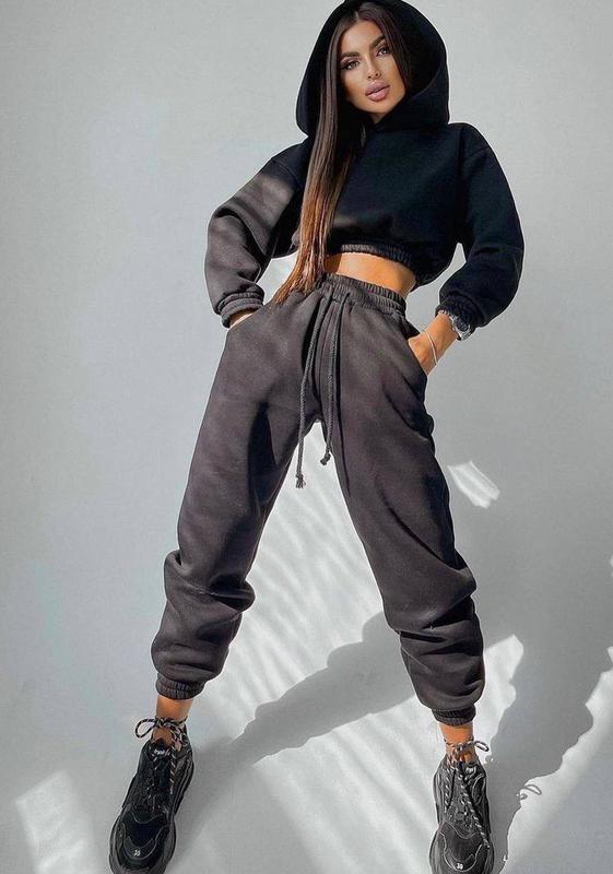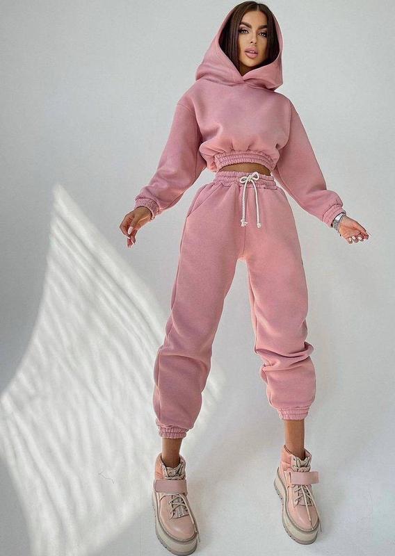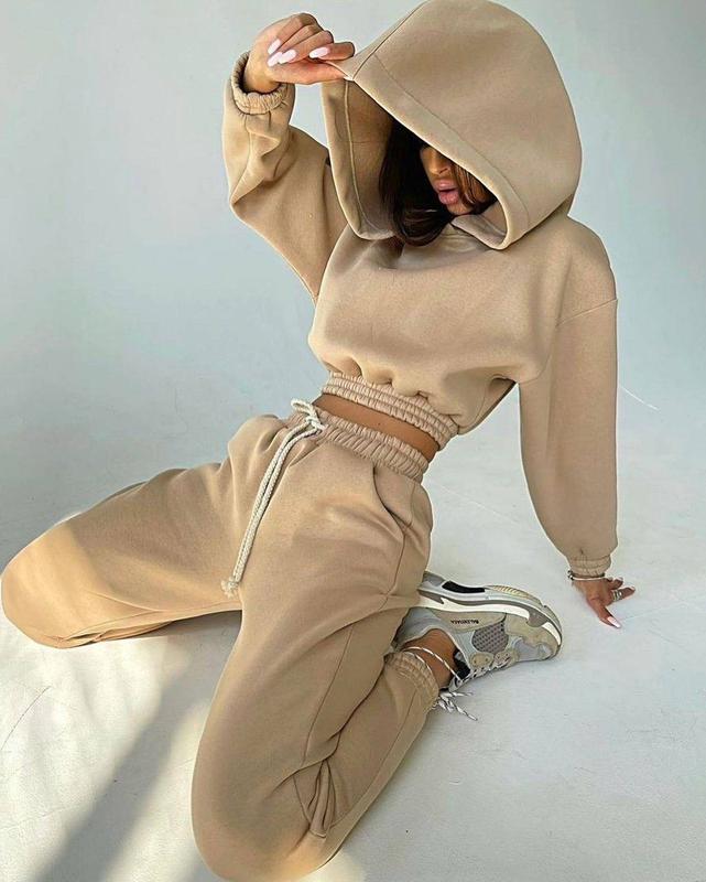 Костюм теплий подвійний капюшон Мод 1817 Тканина трехнитка начіс Колір молоко чорний беж пудра Розмір 42-44,44-46 Довжина Кофта 44 см рукав 68 см Довжина штанів 100 см ОГ 120 см ВІД 72 см ПРО 108 см Ціна 610 грн