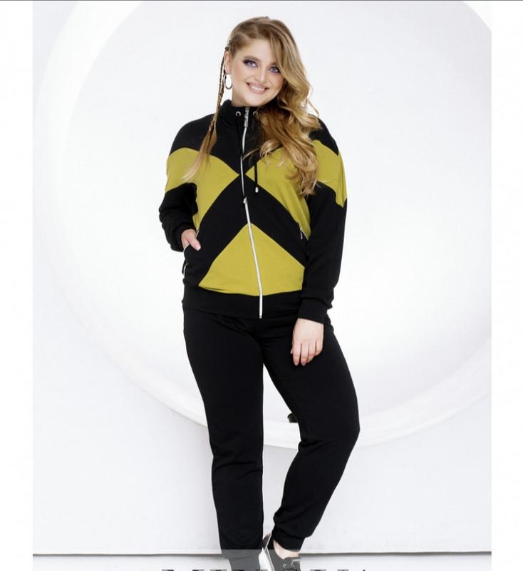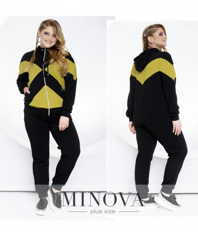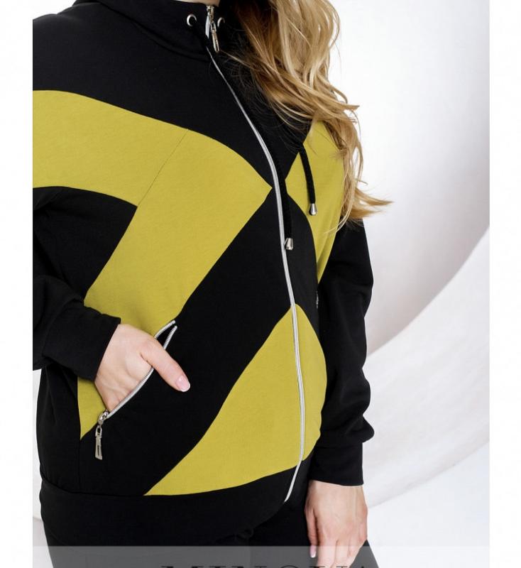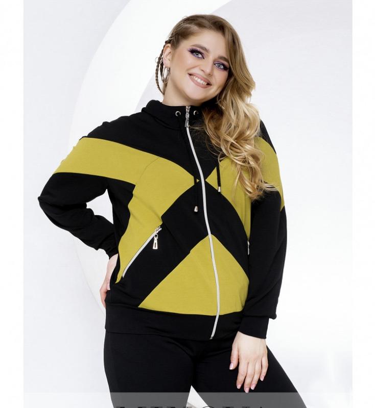 Яскравий спортивний костюм батал з вітровкою та брюками. Вітрівка з капишоном, через капишон пропущено шнурок, отвори укріплені люверсами. Застібка - блискавка спереду по центру. По сторонам - прорізані кишені з блискавками. Рукава з м'якими манжетами. Брюки з високим насадом та вшитою до поясу резинкою, мають кишені у швах по сторонам, внизу м'які манжети.
