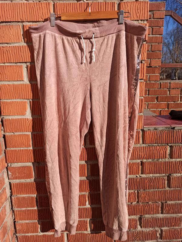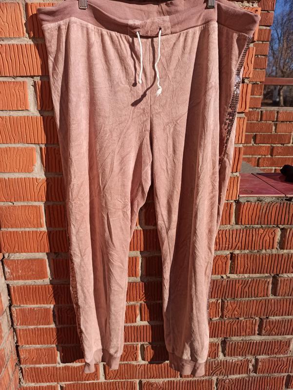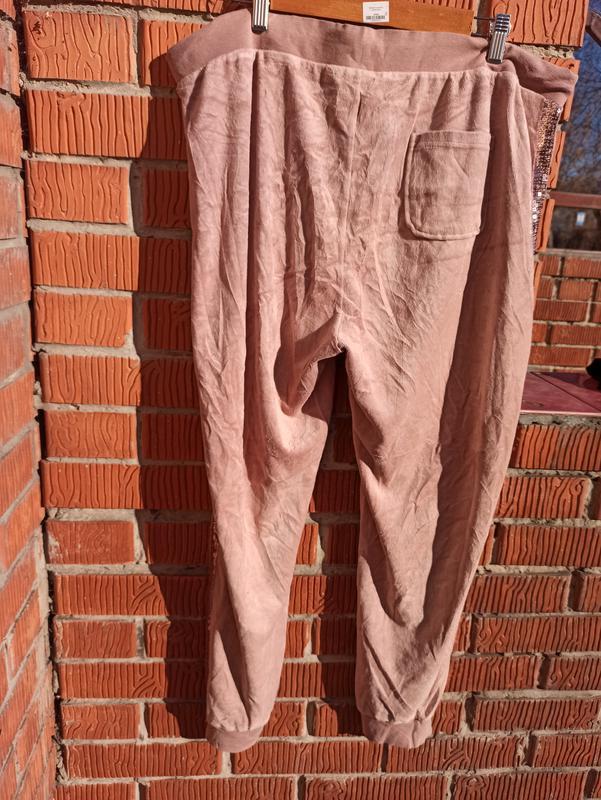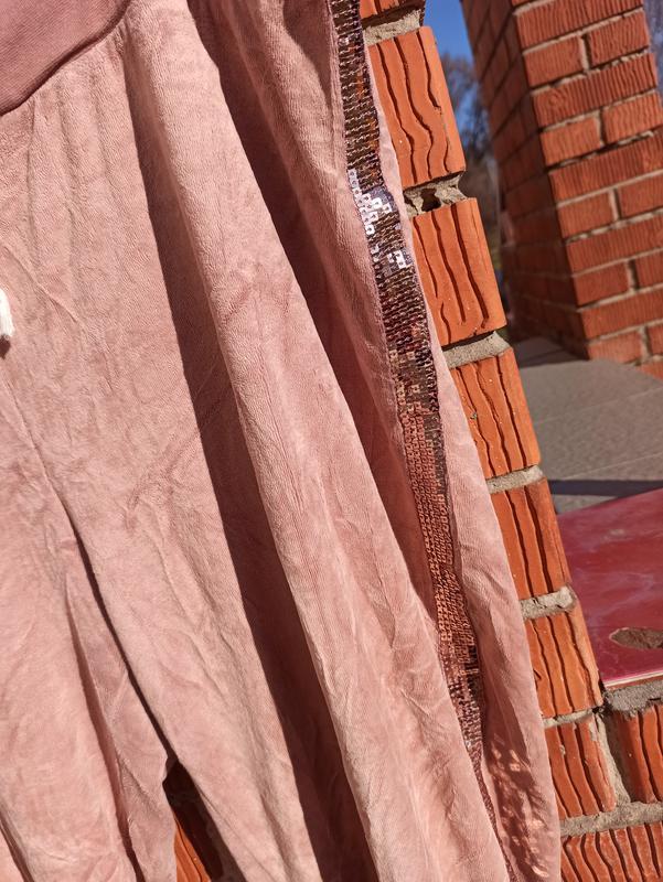 Пояс штанів — широка комфортна гумка, є функціональна шовкова стрічка для регулювання об'єму, штанини на манжетах (джогери), ззаду накладна кишеня, штани з лампасами в паєтках.