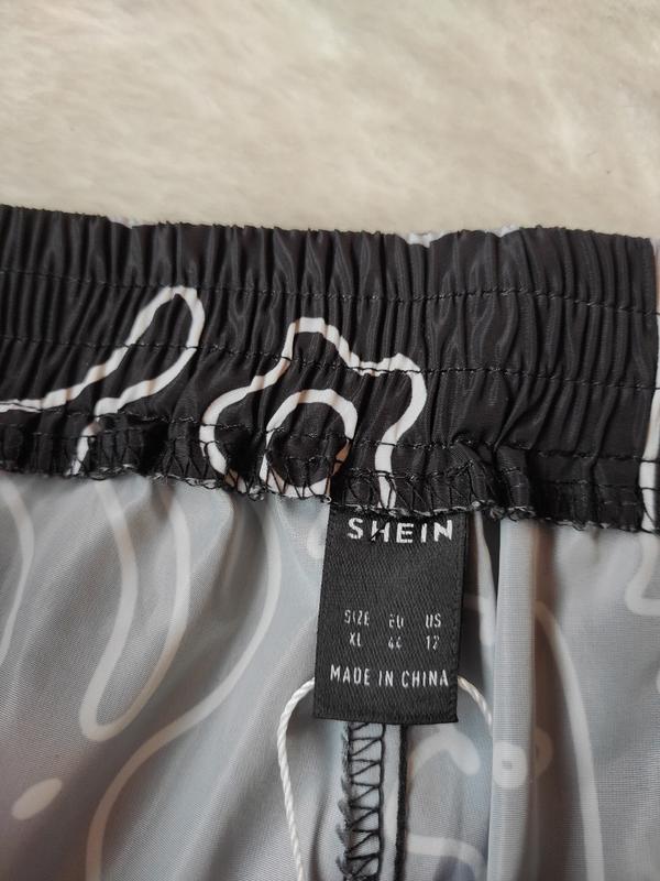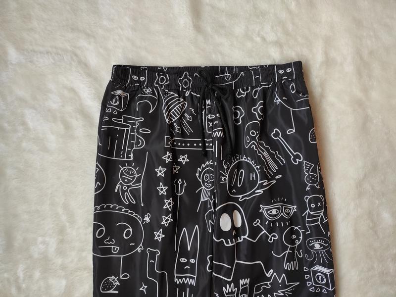 Стан ідеальний, від нових не відрізнити. Колір чорний із білим принтом. Висока талія/посадка із широкою, ущільненою гумкою на талії та шнурком. Матеріал легкий, середній щільності та не тягнеться, за типом плащової тканини. Ціна 1899 грн