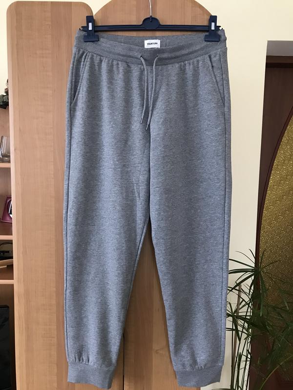 Спортивні штани на флісовій основі, темно-сірого кольору, розмір - М, фірми - YOURTURN. Заміри: пояс - 41см, довжина штанки з зовні - 106см, довжина штанки з внутрішньої сторони - 74см, низ - 14см. Є ще в чорному кольорі. Холодна весна-осінь, зима.
