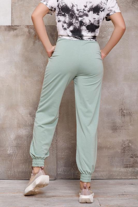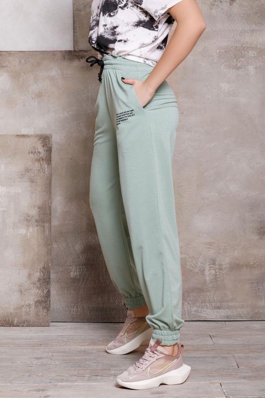 12433_мятныйМолодіжні брюки джоггери вільного крою з нижніми манжетами-гумками і кишенями. Модель виконана з двухнітного трикотажу м'ятного кольору. Модель декорована принтом і тасьмою на поясній гумці.
