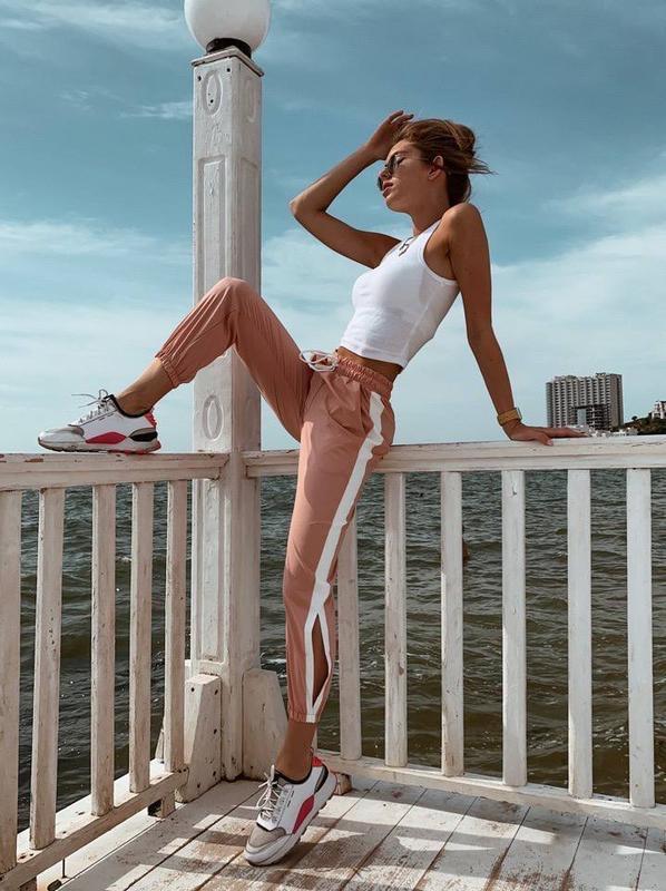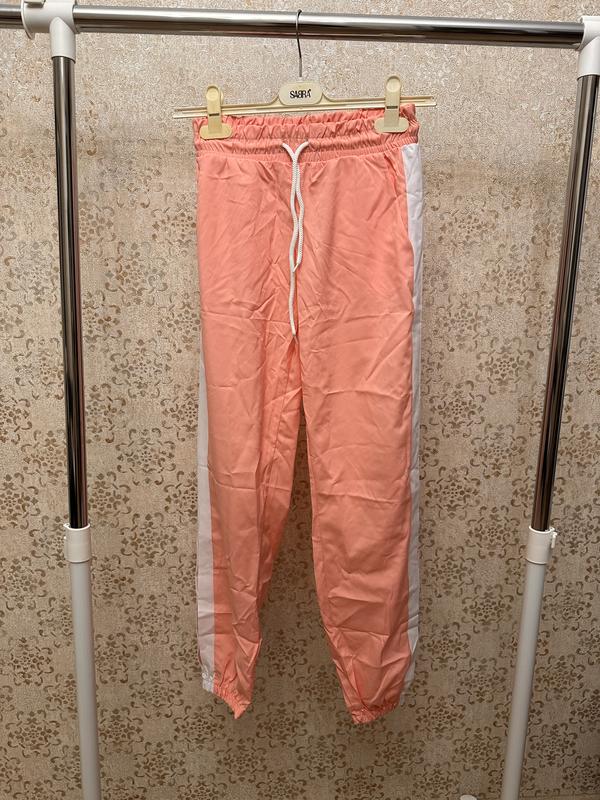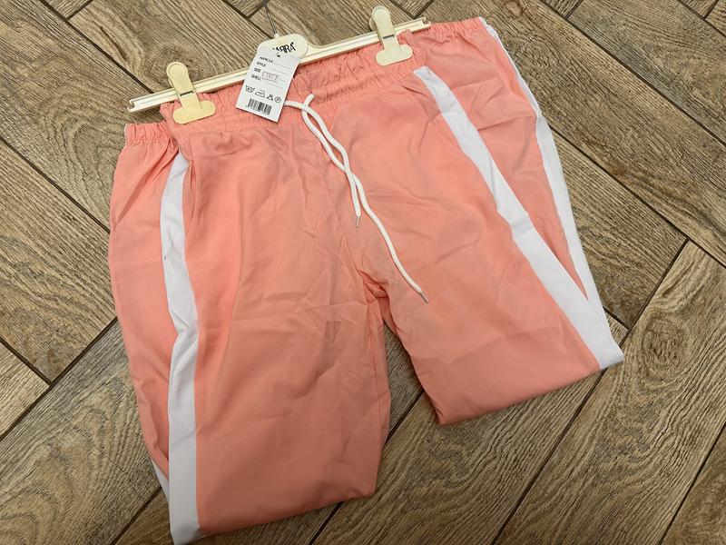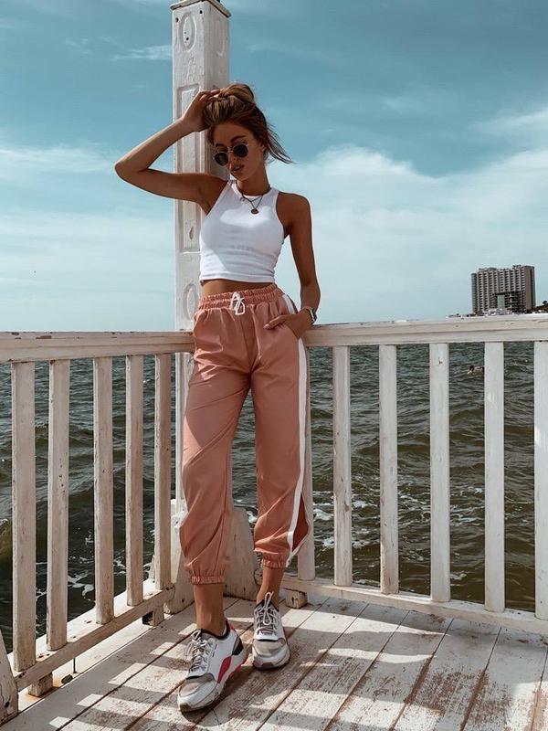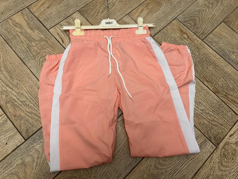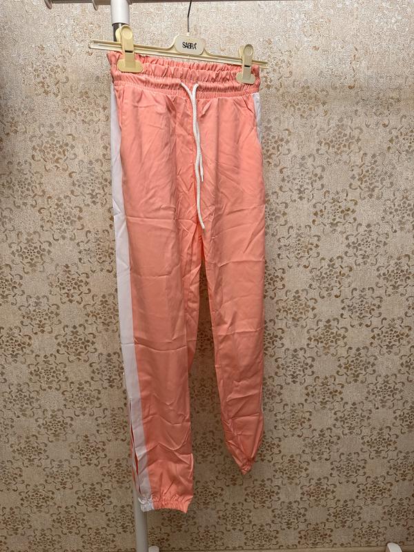 Літні штани з лампасамиТканина : літній євро паплін ( дуже легка та приємна до тіла Тканина )Кольори: персикШтанина внизу збирається на гумку, розріз на нозі як на фото