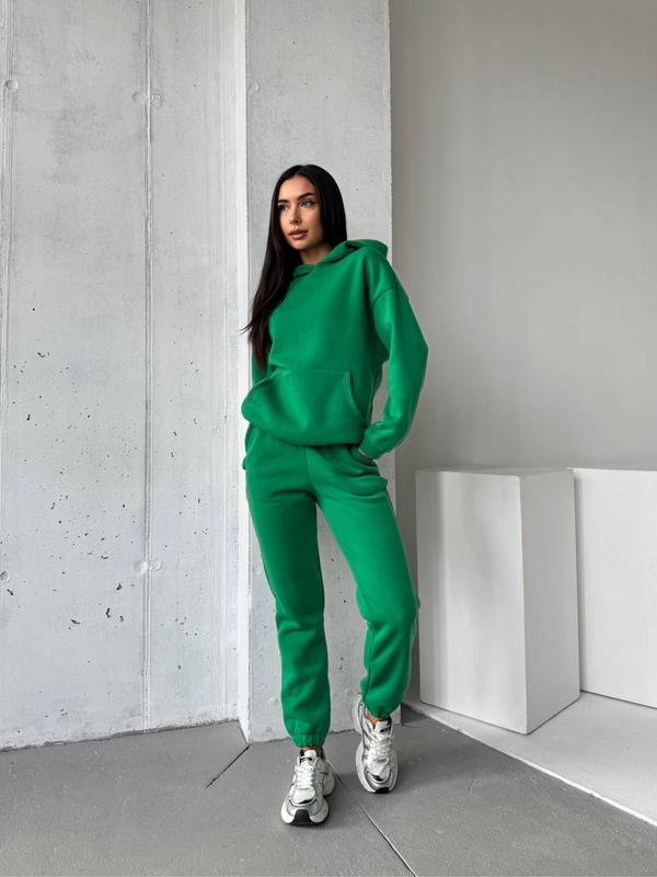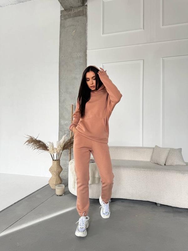 Модель оверсайз, спущені плечі, штани джогери внизу на резинці.