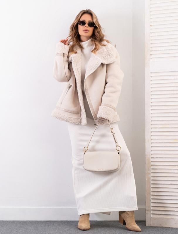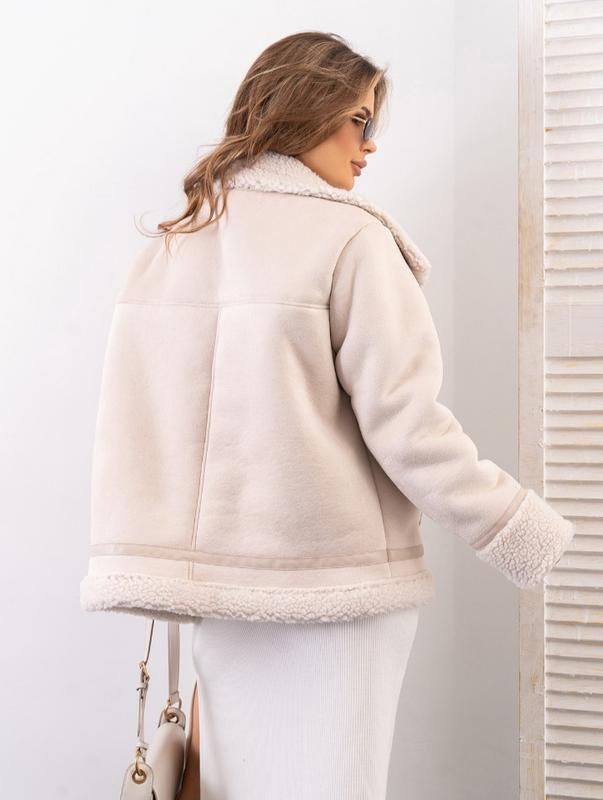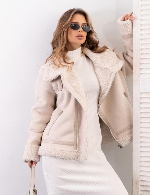 Утеплена коротка дублянка з еко-замші на хутрі. Модель з кишенями та діагональною блискавкою. Виріб оснащений підворотами на довгих рукавах та високим коміром на хлястиках.