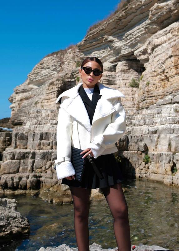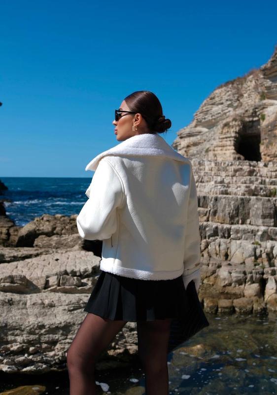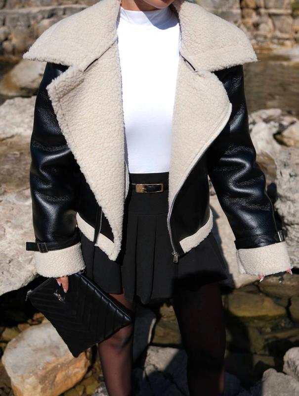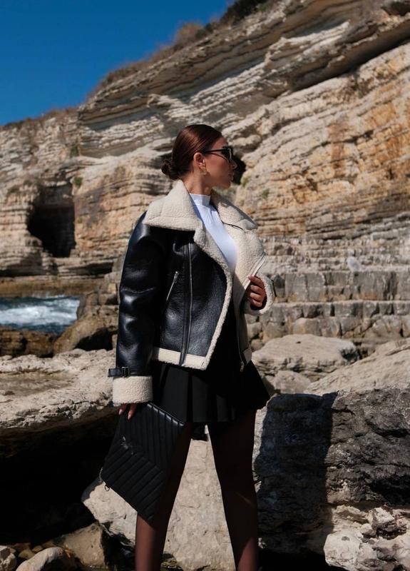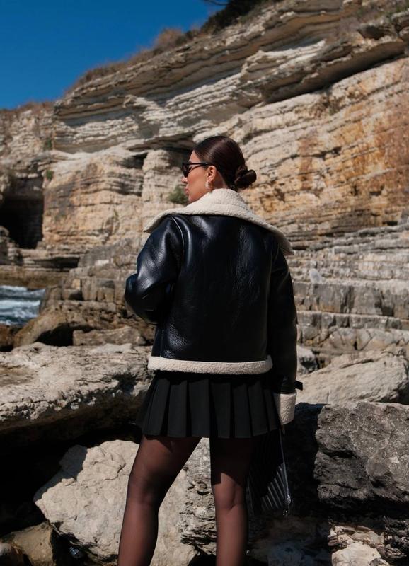 Трендова жіноча куртка-авіатор з хутряним оздобленням, виконана з еко-шкіри premium класу: класичний комір з лацканами, довгий рукав з широкою манжетою і дві місткі кишені на блискавці.