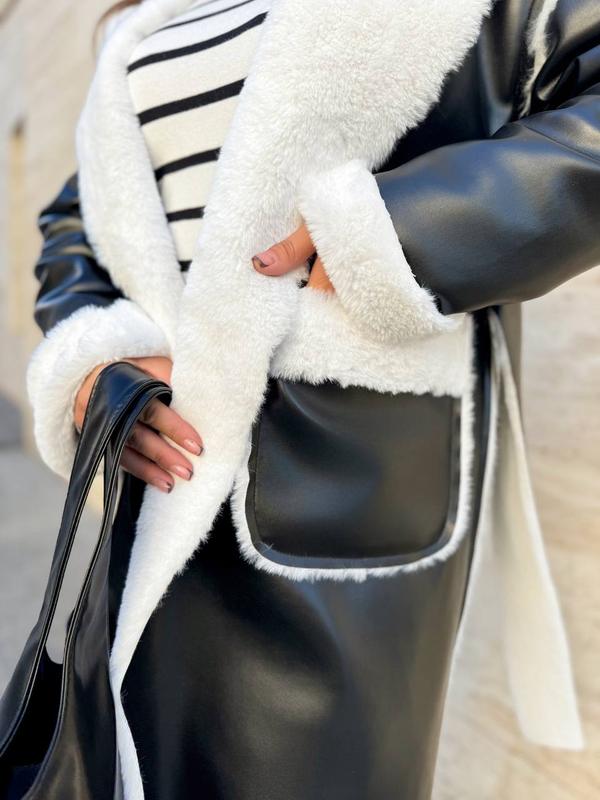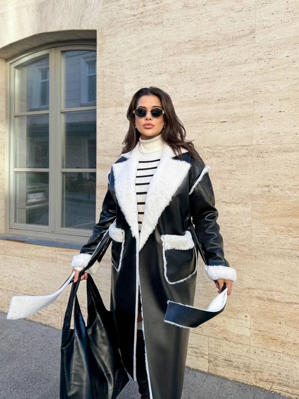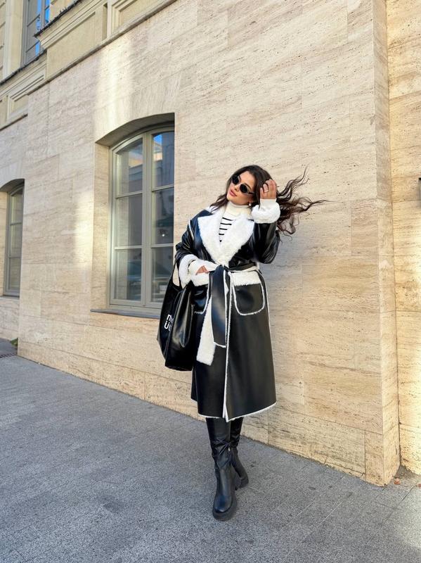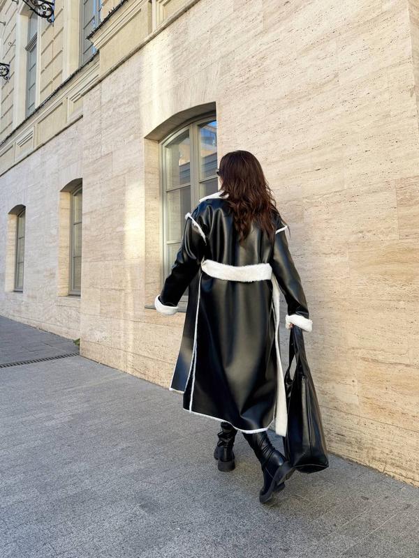 Модель на запах без застібок фіксується за допомогою пояса. Виготовлена з дублянки: экокожа Гарної якості, штучне кроляче хутро. Дуже тепла. Тренд цього сезону, гріє та прикрашає , непромокає. Рукава з підворотами , якими. регулюється довжина від 70-55 см (від плеча). Довжина виробу 115 см.