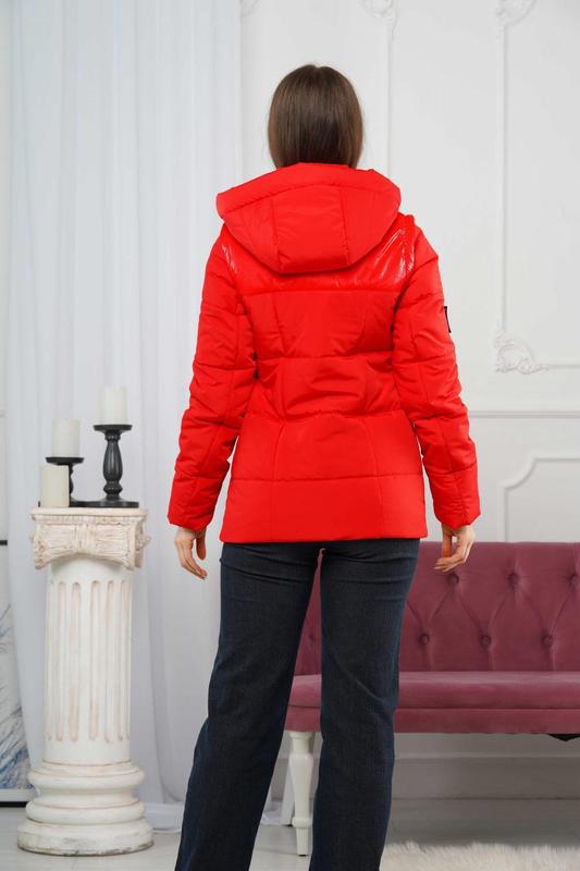 Верхня частина пуховика, по переду та по спинці, виконані з блискучої тканини