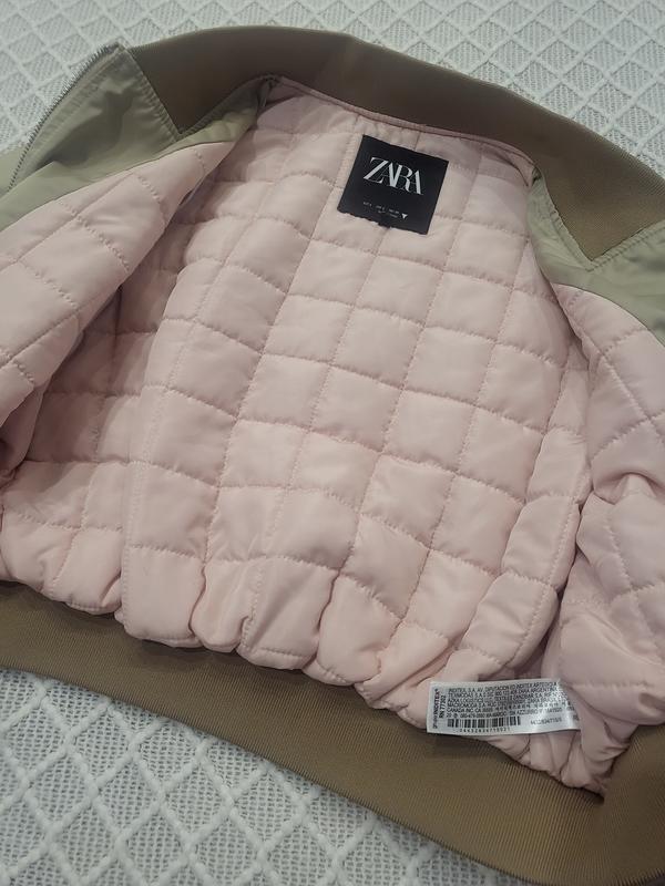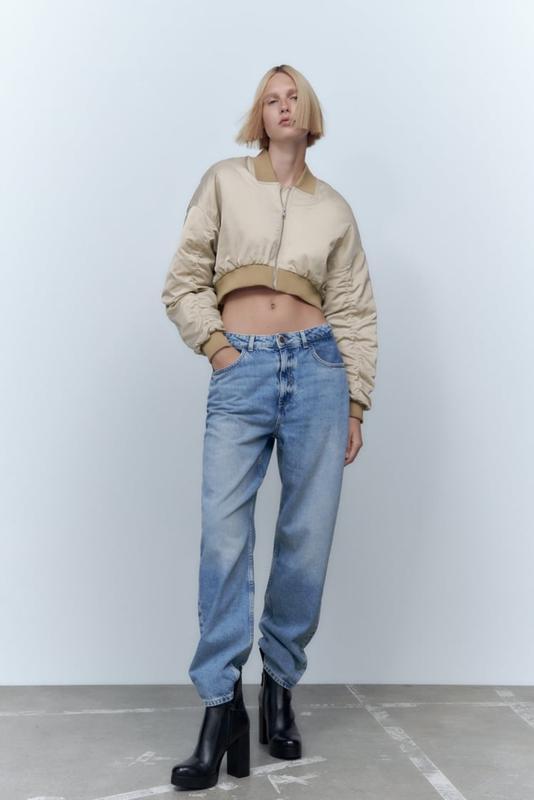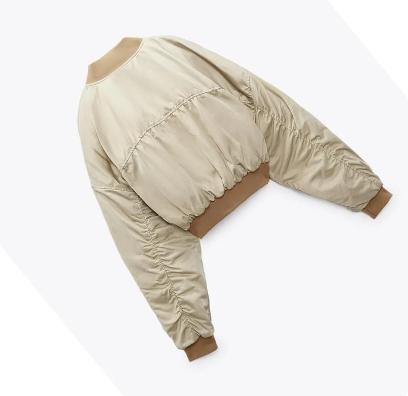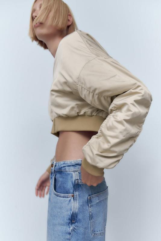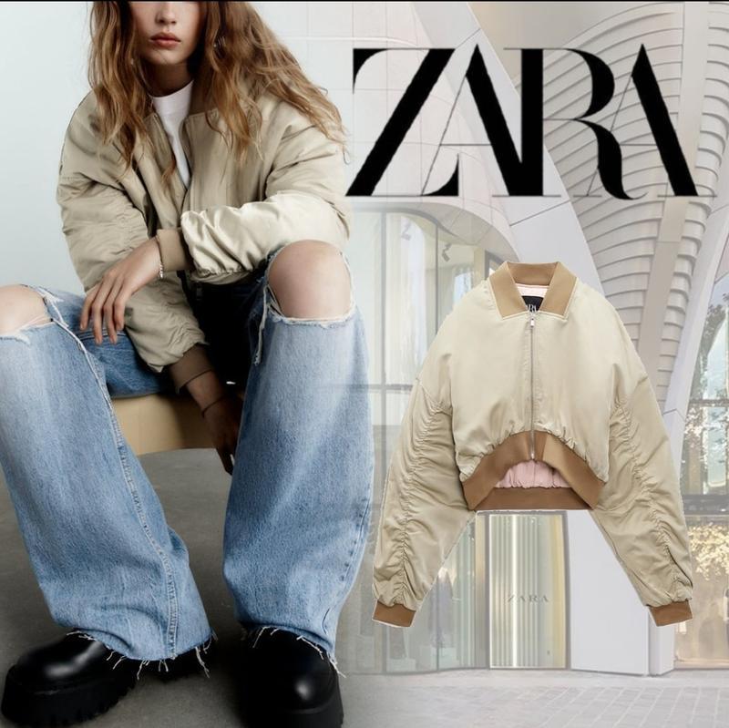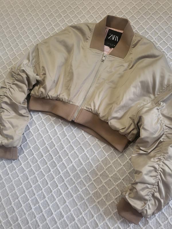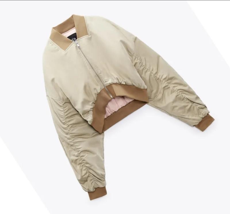 Стильний укорочений бежевий бомбер Zara р. S плечі спущені. Рукав стильно задраперований. Утеплений.Стан нового! Одягнений один раз.Довжина спереду 42 смНа спинці 46 см