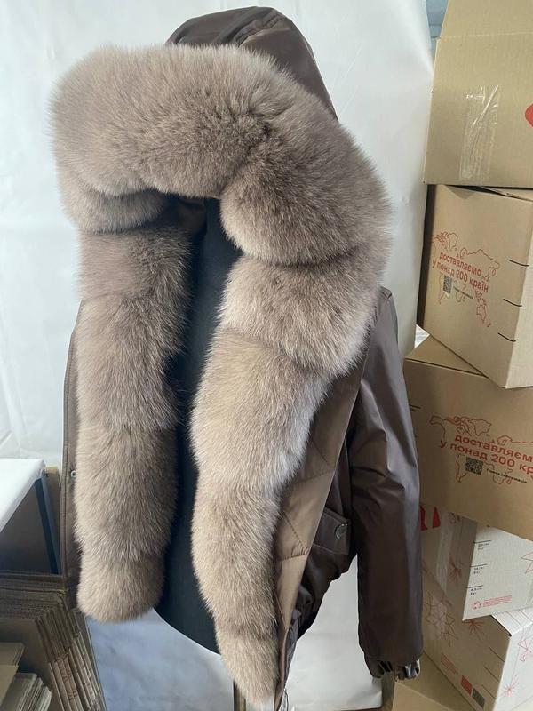 Зимова куртка, бомбер з натуральним хутром фінського песця В забарвленні світлий соболь Хутро знімне водовідштовхувальна вітронепродувна тканина bonding Колір бронза утеплювач hollowsoft 200 (до -20 градусів) фурнітура метал. Довжина 65 см Довжина рукав 64 см стандарт Дві глибокі кишені Манжети на резинці, резинка внизу куртки Розмірний ряд 42-60 Розміри 56-60 плюс 350 грн до ціни.