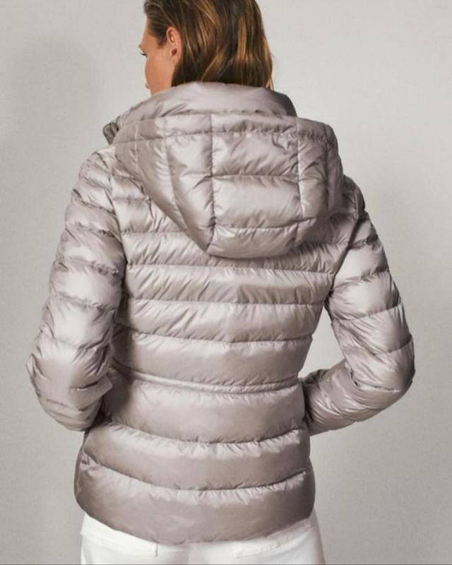 Laminated quilted down jacket Регульований знімний капюшон. Застібка-блискавка, прихована планкою. Два бічних кишені На підкладці. Заміри по розміру довжина рукава від коміра 68 см довжина рукава від плеча 58 см ширина під руками 48см ширина в талії 45 см ширина по низу 54 см довжина по спинці 62cm Склад: Зовнішній нейлон 100% Оболонка ПОКРИТТЯ поліуретан 100% ОСНОВНА ТКАНИНА нейлон 100% Внутрішній білий качиний пух 90%, перо 10%