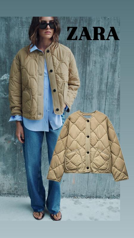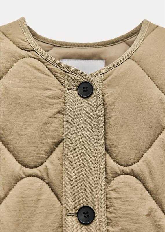 Водовідштовхувальна стьобана куртка з круглим коміром і довгими рукавами. Накладні кишені спереду. Застібається на ґудзики