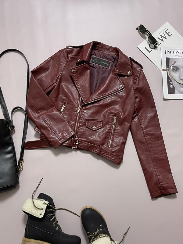 косуха винного кольору Кож зам високої якості Щільний Блискавки металеві Стан нова ( одягалась один раз для реклами фото ) Розмір М по факту гарно на ХС,С