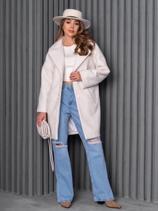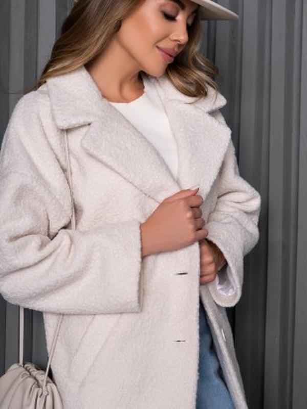 Демисезонное молочное пальто-кокон, выполненное из букле с нижним подкладом. Модель с карманами и длинными рукавами оснащена классическим воротником. Пальто на пуговице с длиной до колен.