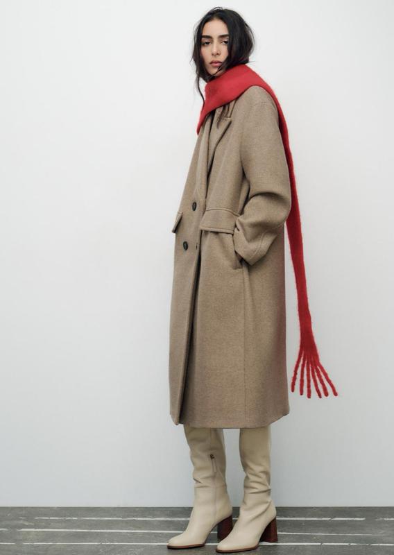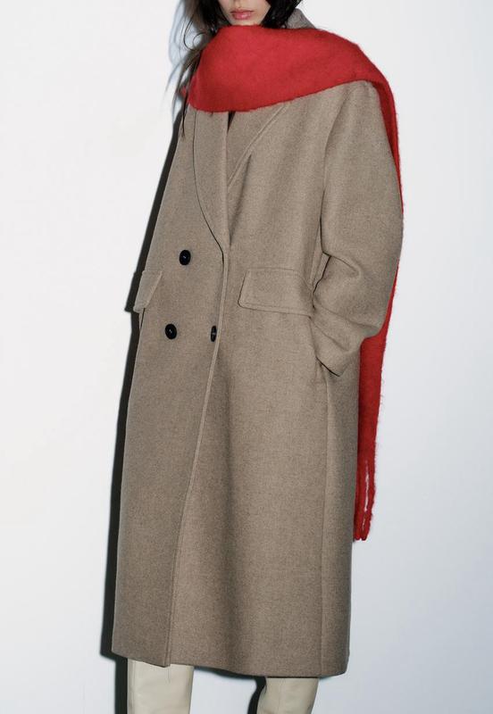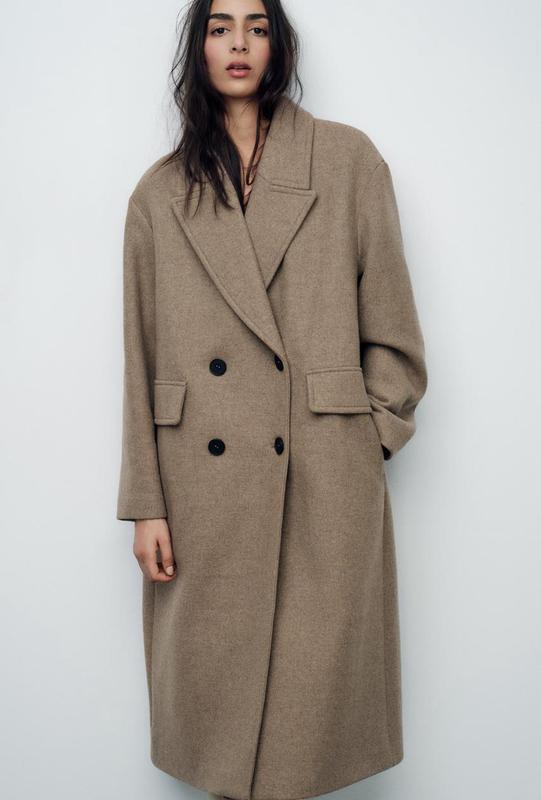 Двобортне пальто зі змішаної вовняної тканини вільного крою.