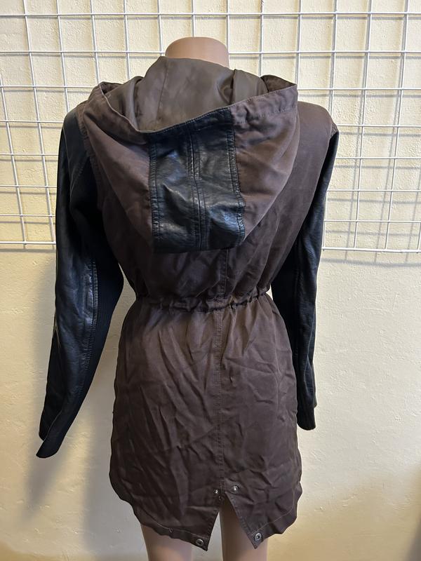 По бірці М, таке як натуральна шкіра але точно не впевнена. Шкіра не затерта. Стан парки ідеал!