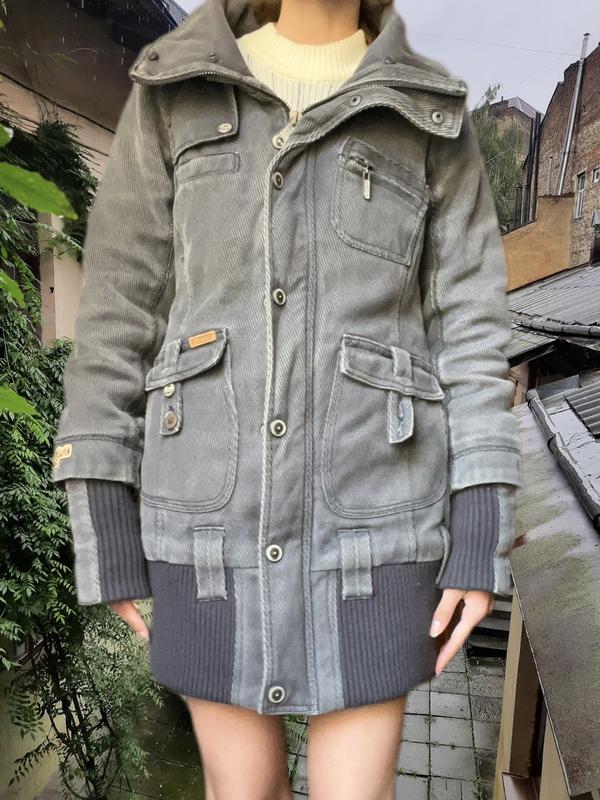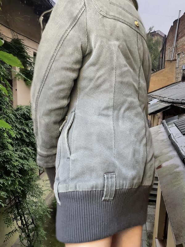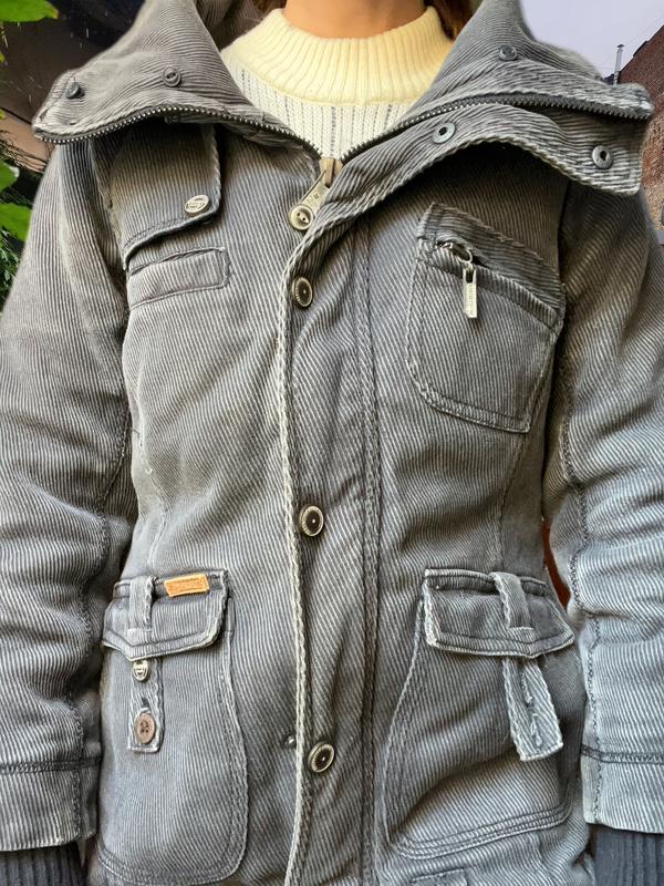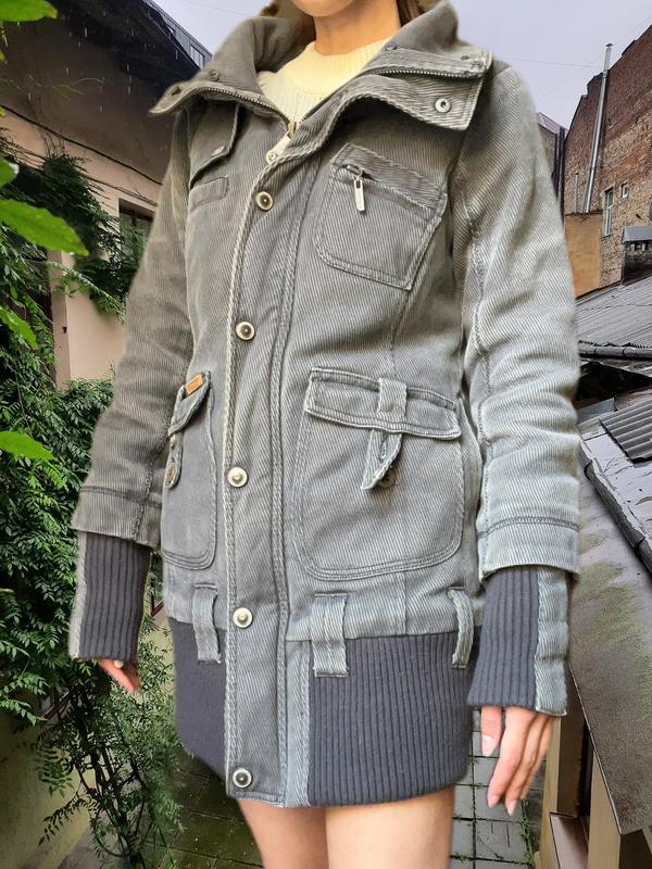 Багато деталей з карманами, нашивками та застібками, рукава та низ щільно прилягають. Куртка важка, з утепленням, без капюшонаЗаміри:Довжина 76Обхват грудей 50Від плеча до плеча 41Рукав 67