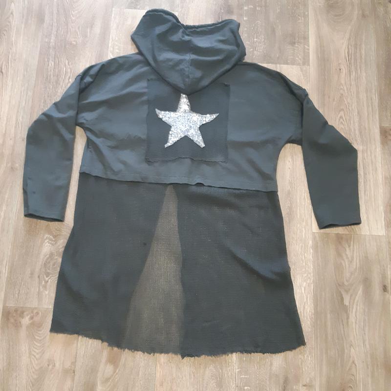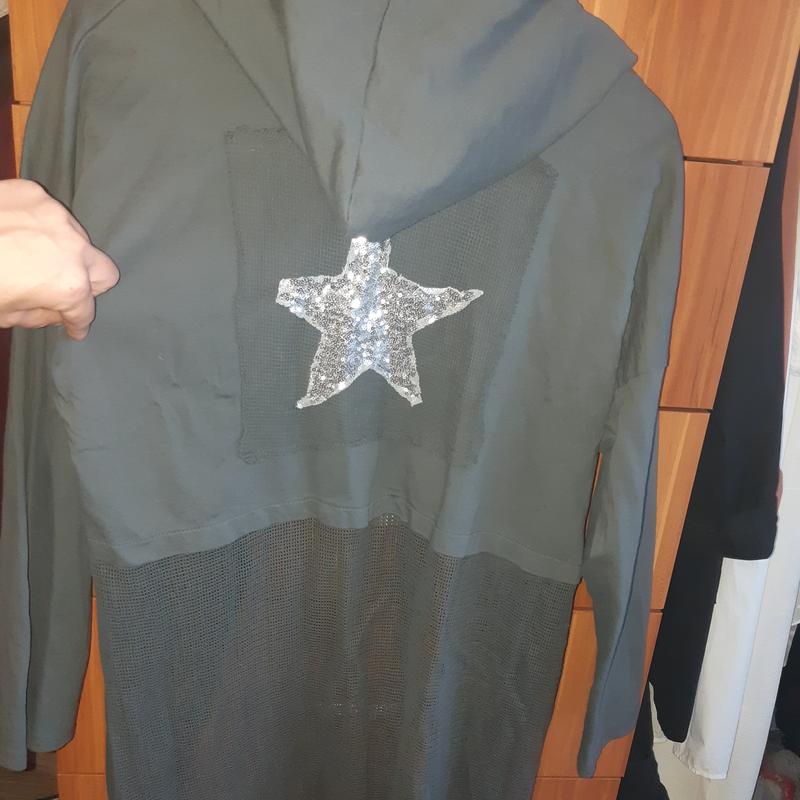 Стильна тренч-накидка, спортивного стилю, капюшон середньої глибини на зав'язках об'єм грудей 54см Плече спущене, 54см довжина рукава Діна 81см, 38см непрозора верхня частина виробництво Італія, ручна робота, якість 90%бавовни і 10%бамбук Одягалася кілька раз, стан відмінний!! Якщо потрібні додаткові фото і всі питання в повідомленні відповім)