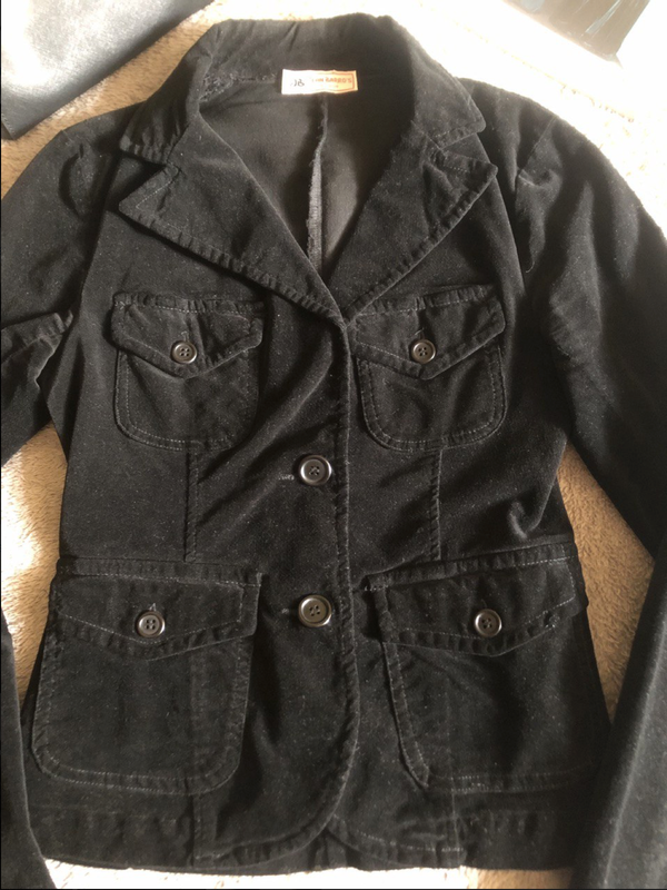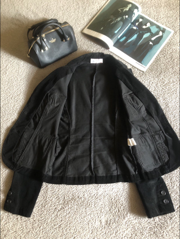 Красивий піджак від французського бренду Jean Barro приталеного силуету із натурального велюру глибокого чорного кольору з додаванням спандексу – трохи тягнеться та чудово сідає на фігуру. Накладні кишені з клапанами та гудзиками – нагрудні та внизу, гудзики на рукавах, без підкладу та без шліци. Дуже якісно пошитий. Підійде підійде на XS-S-М. Довжина 57 см, під пахвами 42-46 см, талія 36-37 см, низ 46-48 см, рукав 62-63 см