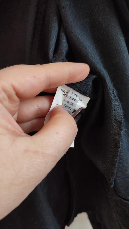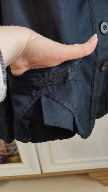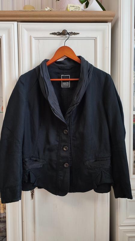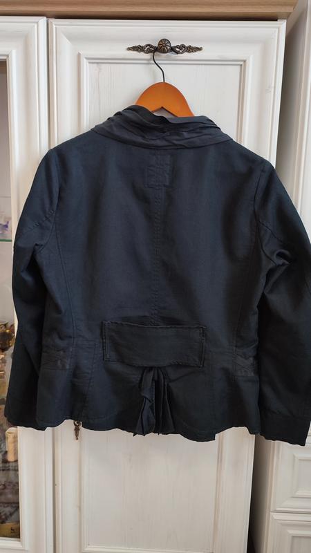 Жакет з коттону та льону, розмір 48, дизайнерська річ Marithé Francois Girbaud, важко назвати колір між темно-синій та чорним. Стан ідеальний. Довжина 57 см,плечі 40, довжина рукавів 52, ПОГ 52, ПОТ 46