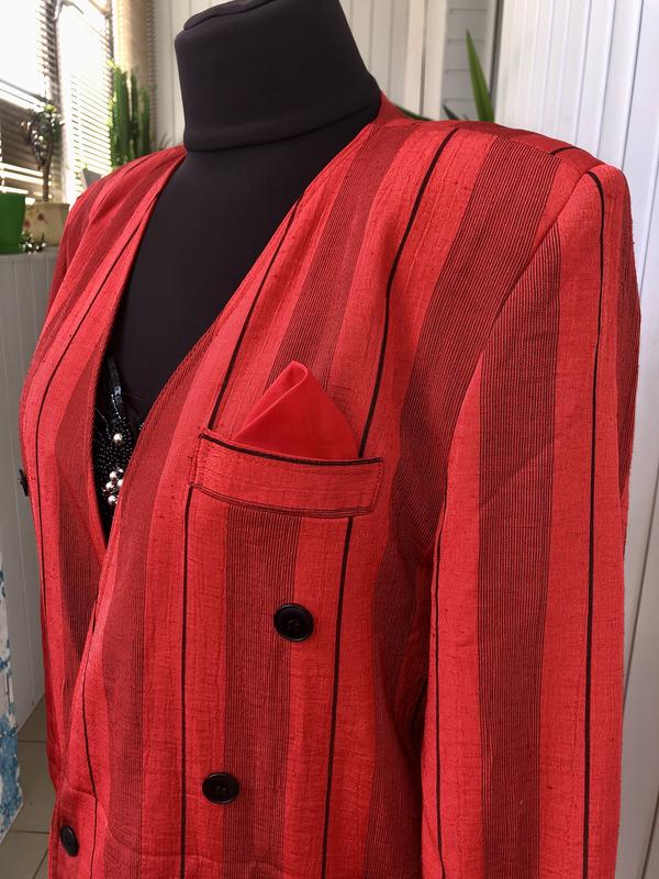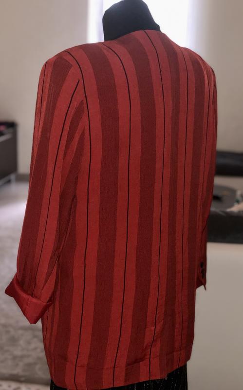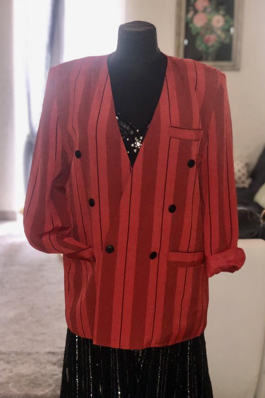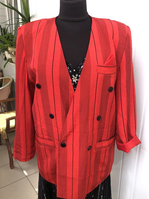 Шикарний гламурний ошатний блейзер в ідеальному новому стані. Вінтаж. По фігурі сідає дивовижно. Тканина подібна дикому шовку., з легким блиском. Підійде на 46-52 розмір. Можна перешити ґудзик. Як oversize-дуже круто. Великі плечі. Бренд не вказано.