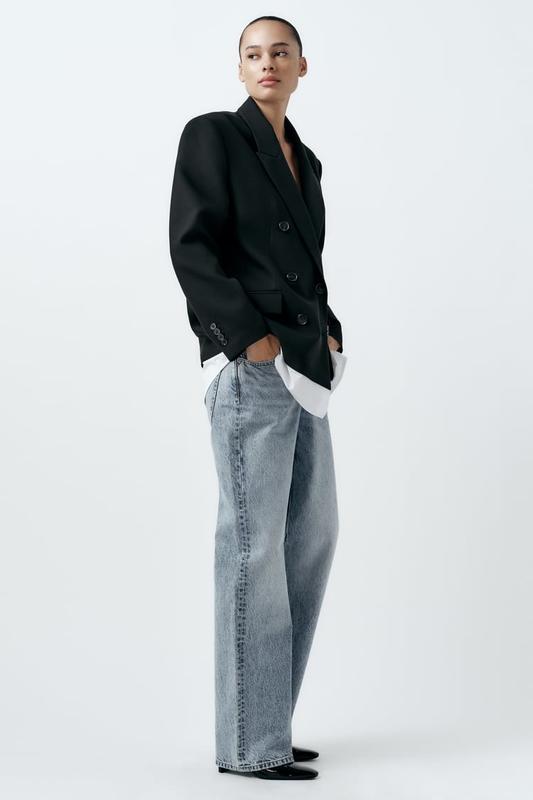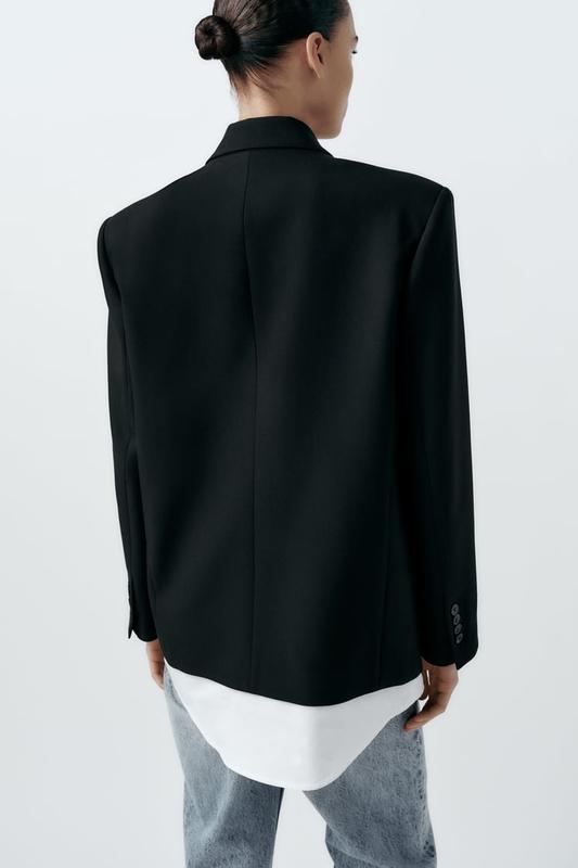 Двобортний блейзер із гострими лацканами, довгими рукавами та підкладкою під тон. Застібається на ґудзики спереду та на манжетах. Прорізна кишеня на грудях, кишені з клапаном на стегнах і контрастний попліновий низ.
