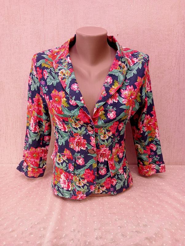 Піджак, жакет жіночий. Фірма Vera&Nadazhda, розмір 44. Легкий котон, трохи тягнеться. Має два гудзика, принт квіти, різнокольоровий. Заміри зроблені при спокійному стані. Пог 43, довжина по спині 55, рукав 44. Б/у в гарному стані (на гудзику е подряпина)