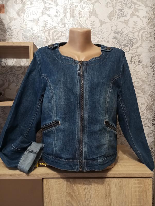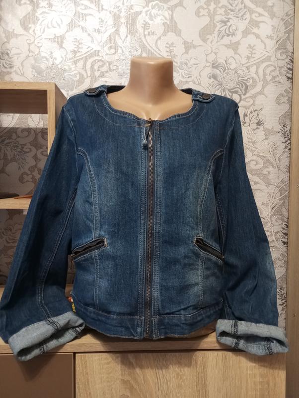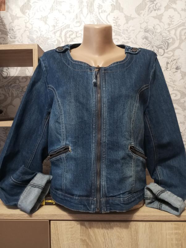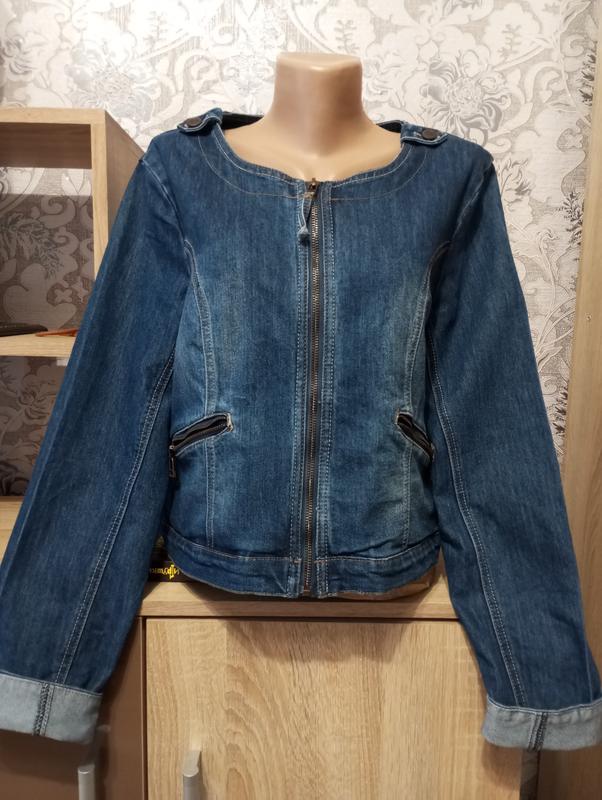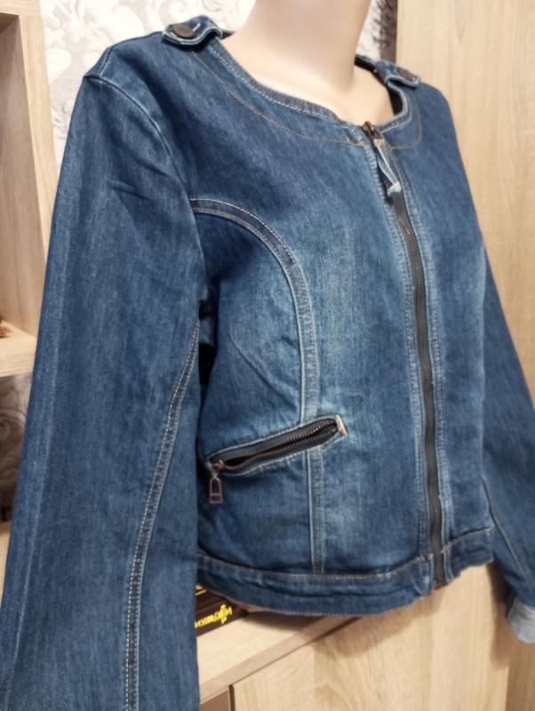 Стрейчевий, вкорочений, джинсовий піджак у відмінному стані. Тканина середньої щільності, тягнеться. Рукав можна підвертати. Є кишені під блискавками .