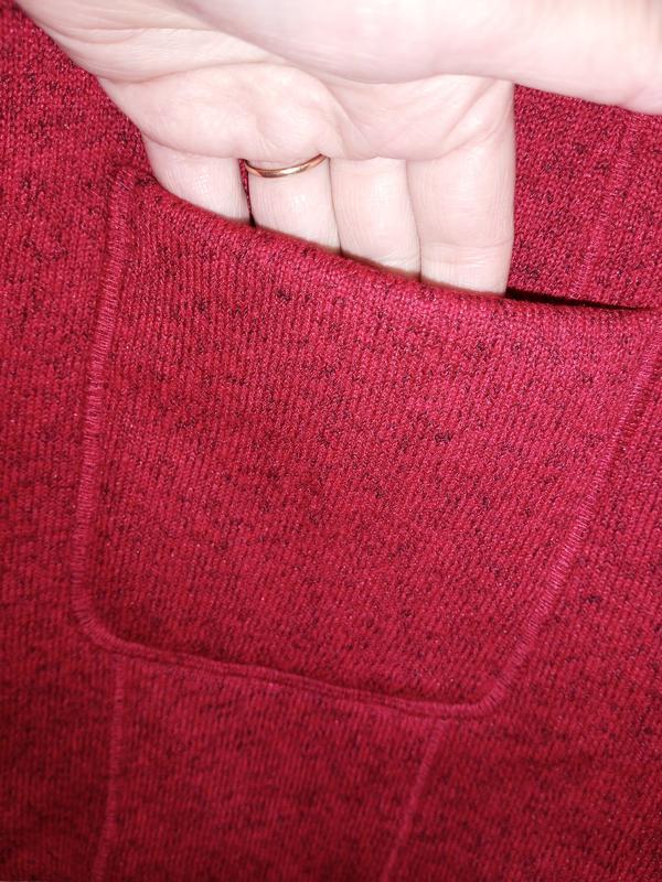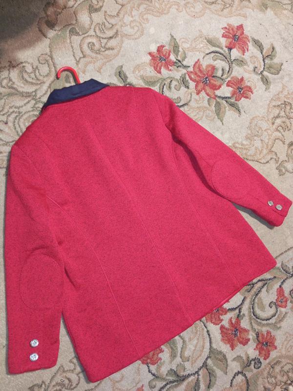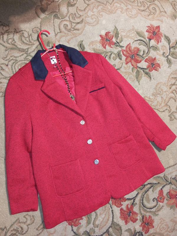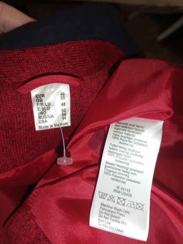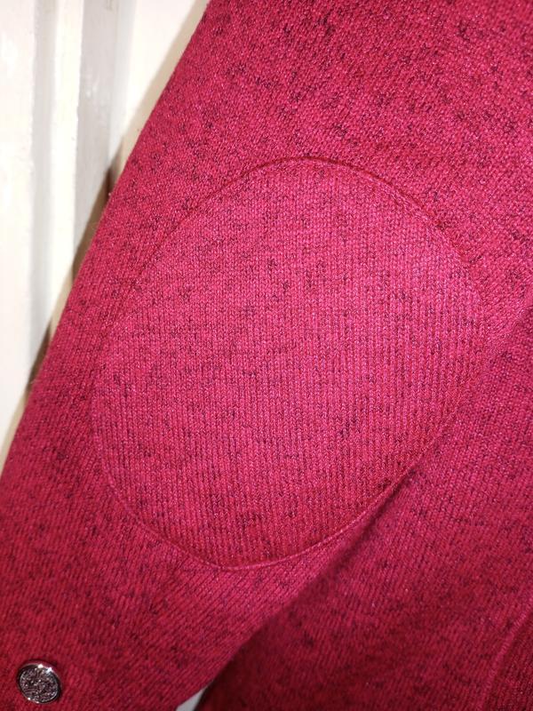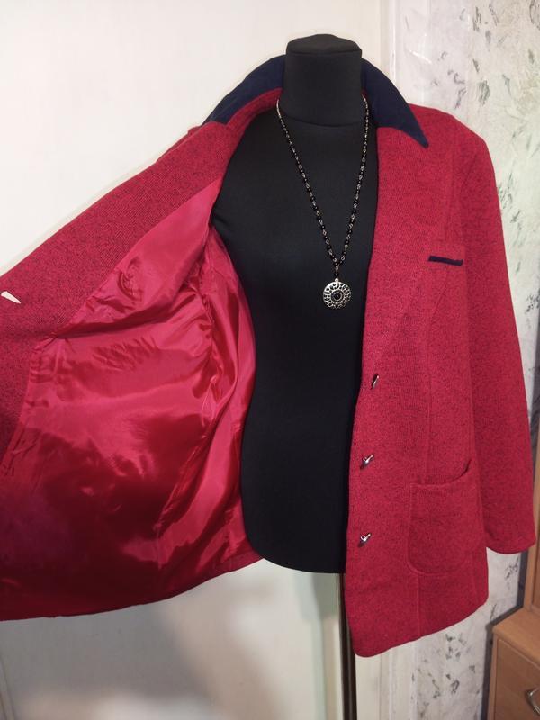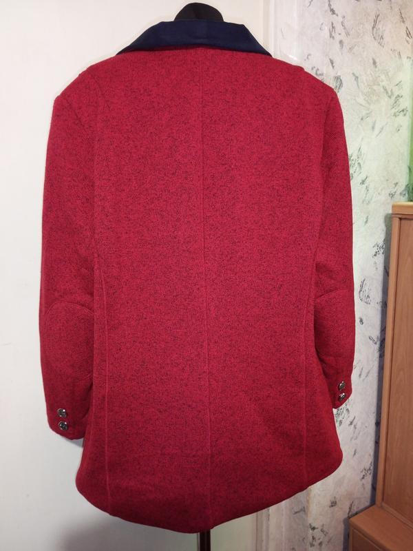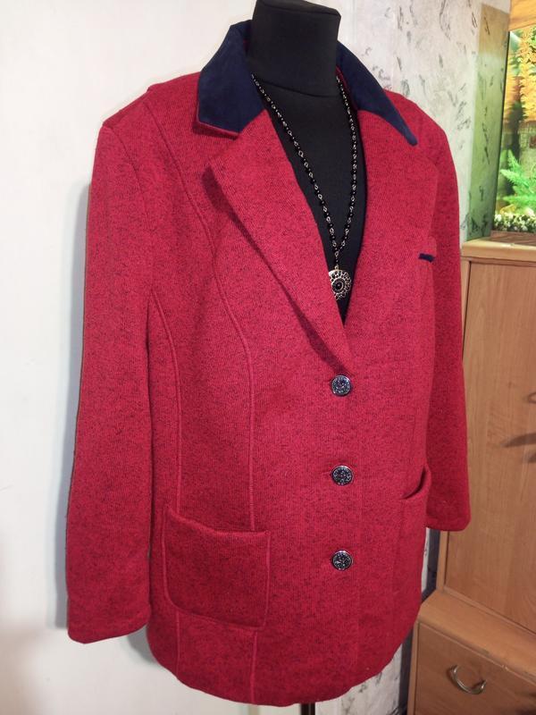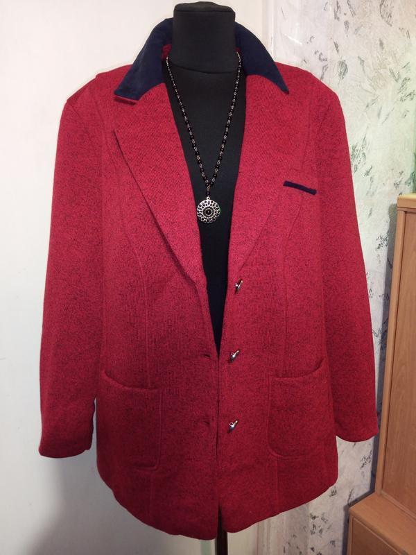 Шикарний, офисный -и не только, трикотажной вязки-меланж, приталенный жакет-пиджак на подкладке, с накладными карманами и заплатками на локтях, большого размера, немецкого дизайна, Вьетнам. Цвет: красный с лёгким оттенком в вишню и чёрными вкраплениями; воротник-тёмно-синий под замш. Размер Gb20, Rus 54 (остальные на бирке),но ориентируйтесь по замерам: длина по спинке 64см,ПОГ по спинке от подмышки до подмышки - 62см + есть вертикальные выточки; ПОТ 57,5см +; ПОБ -по низу карманов-61см; ПО по канту 62см; длина рукава -57см - вероятно,укорачивали (в цене учтено); ПО проймы 29см; ПО бицепса 20см+; ширина плеч 44,5см Без катышков, качественнная вещь с красивыми,серебристыми пуговицами. Подойдёт и на работу,и на выход.