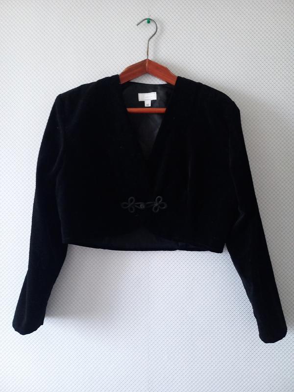 Болеро, укорочений жакет з чорного оксамиту. Тканина зі 100% ба вовни. Сам оксамит чудової якості насиченого чорного кольору та у відмінному стані - без заломів і потертостей. Жакет має підплічники. Застібка-клевант із шовковистої мотузки є прикрасою речі. Ромір 40. Стан ідеальний. Заміри: під рукавами - 53см, довжина - 43см, рукав - 60см.