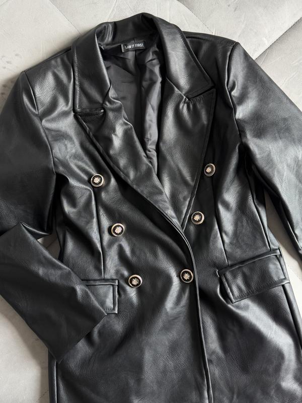 Новий шкіряний жакет, сідає дуже гарно по фігурі, підкреслює талію Можна на прохолодну погоду, або на ранню осінь/ весну Гарні ґудзики, жакет йде з карманами Довжина- 78 см ПОГ-46 см ПОТ- 43 см ПОС- 53 см Рукав- від плечового шву- 57 см