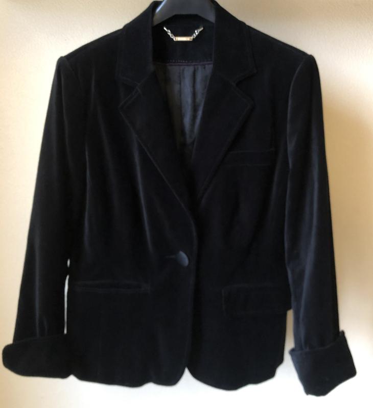 Базовий чорний велюровий піджак YESSICA. Приталений Фасон з можливістю моделювання довжини рукава. Застібка - атласна ґудзик. Розмір: 42 Виміри: п/про грудей 50 см п/о стегон 48 см довжина піджака 65 см Піджак в ідеальному стані (сліди шкарпетки ВІДСУТНІ).