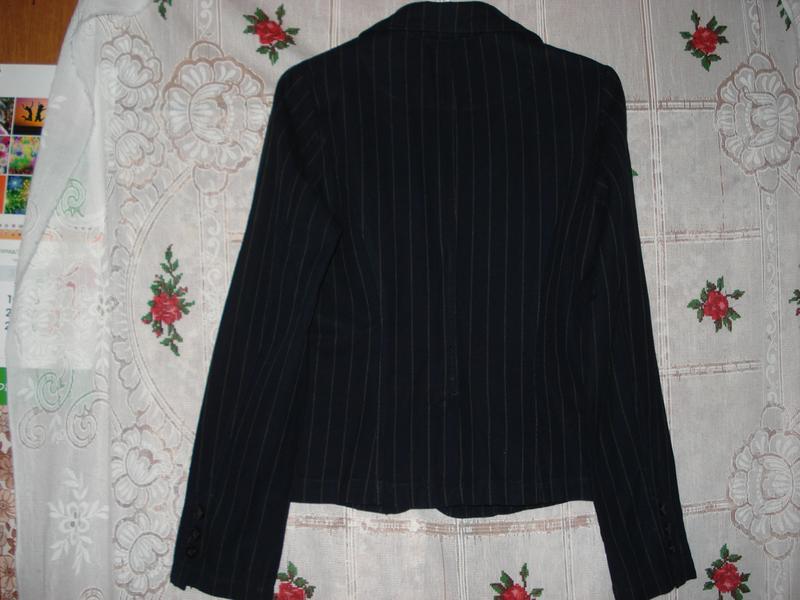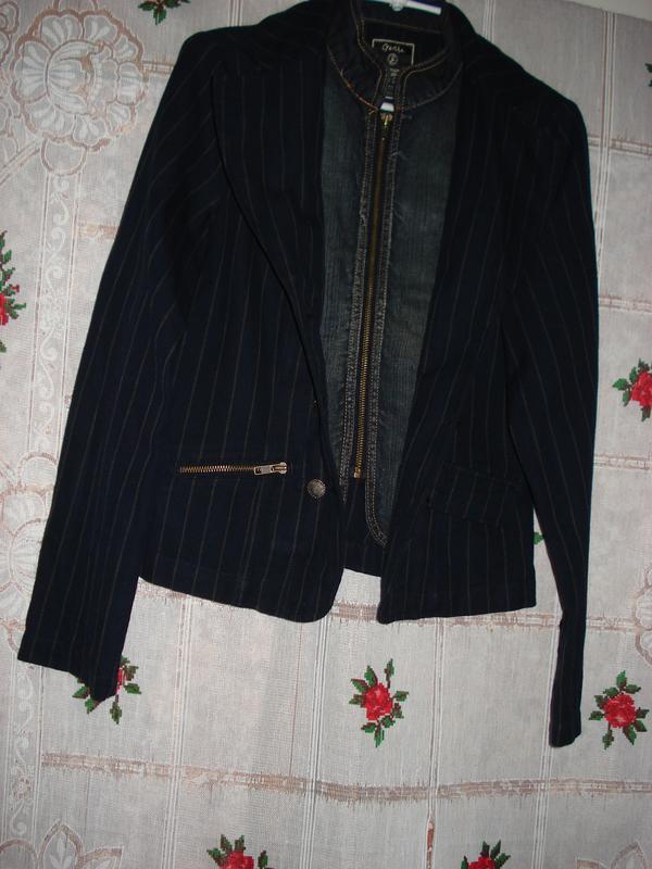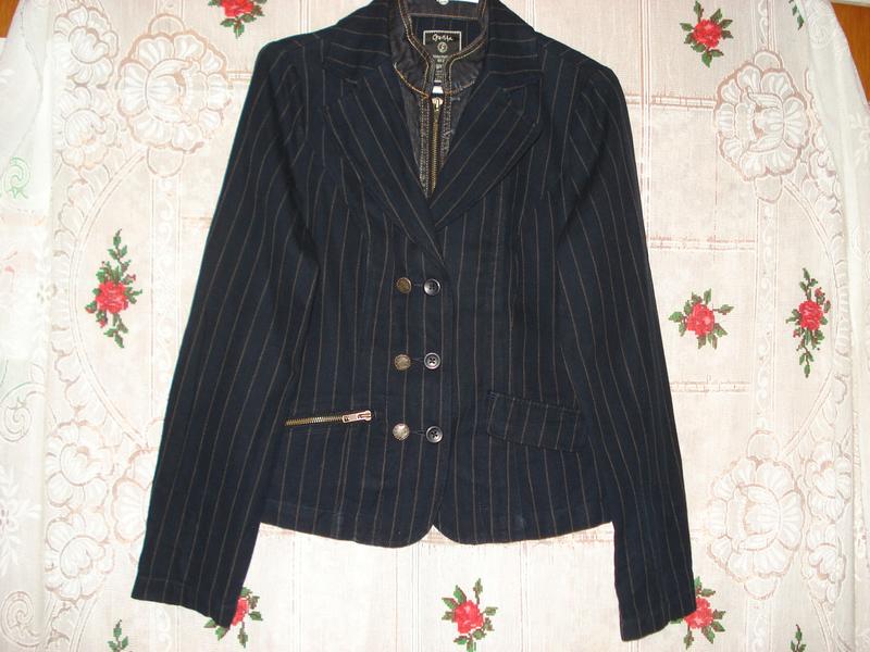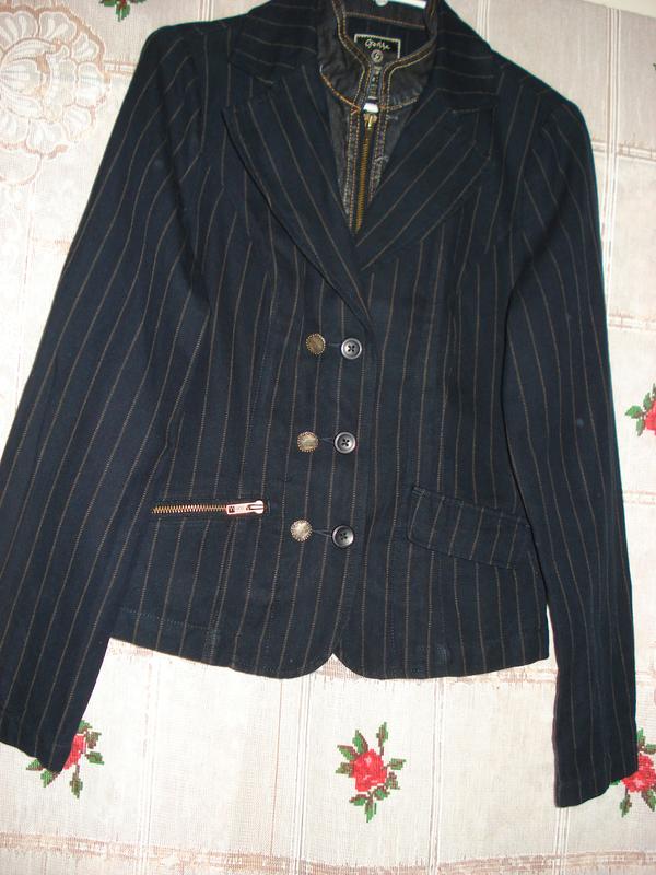 Шикарний,стильний,фірмовий,натуральний піджак чорного кольору з жовто-помаранчевими фірмовими рядками,попереду два ряди гудзиків,застібається на гудзики і попереду вставка з синього джинса на замку-блискавці,спереду дві кишені,один на замку-блискавці,ззаду внизу по центру розріз,рукав довжиною-64см.закінчується манжетом з трьома ґудзиками,об'єм грудей-87см.,об'єм талії-80см.,довжина 56см.