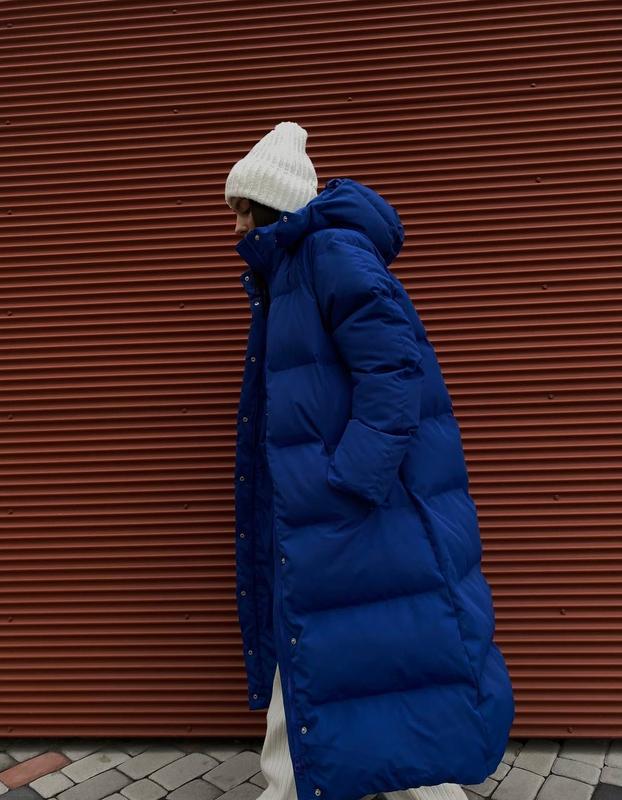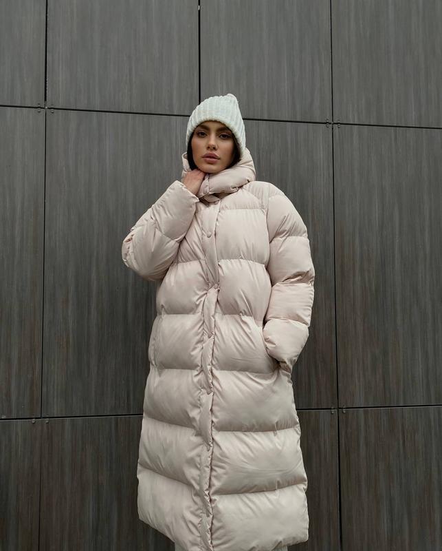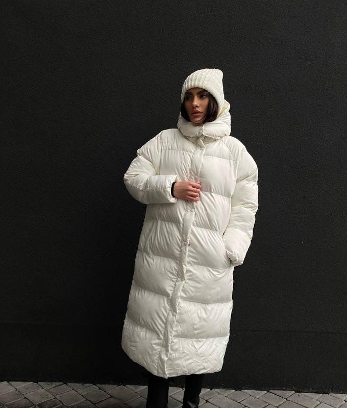 Довгий пуховик з капюшоном. Капюшон з‘ємний, є кишені, застібається пальто на молнію + кнопки