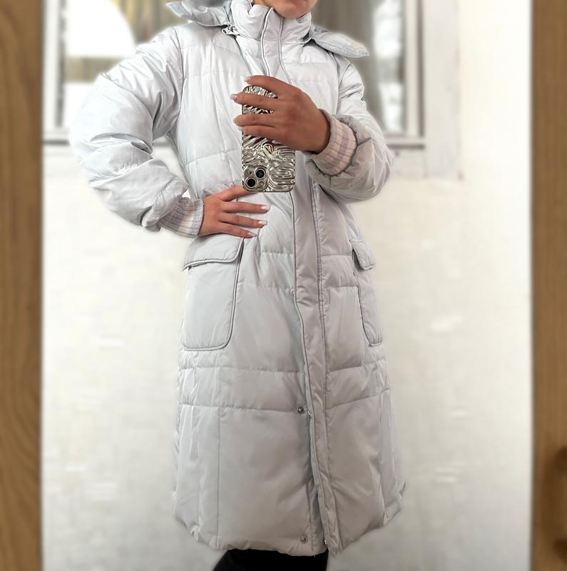 Зимовий пуховик oviesse ніжно-блакитного кольору. Виглядає як хмаринка. Є два зовнішні кармани, капюшон та манжети на рукавах. На середні морози, наповнювач пірʼя. Розмір s.