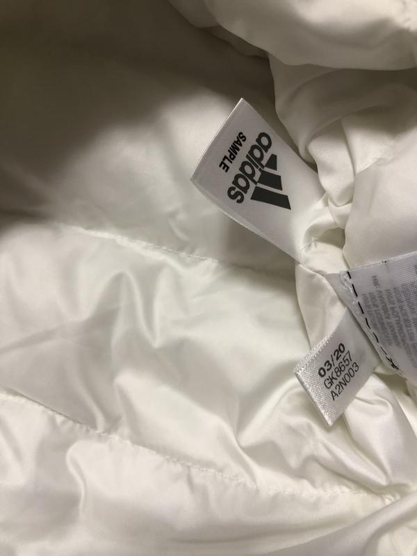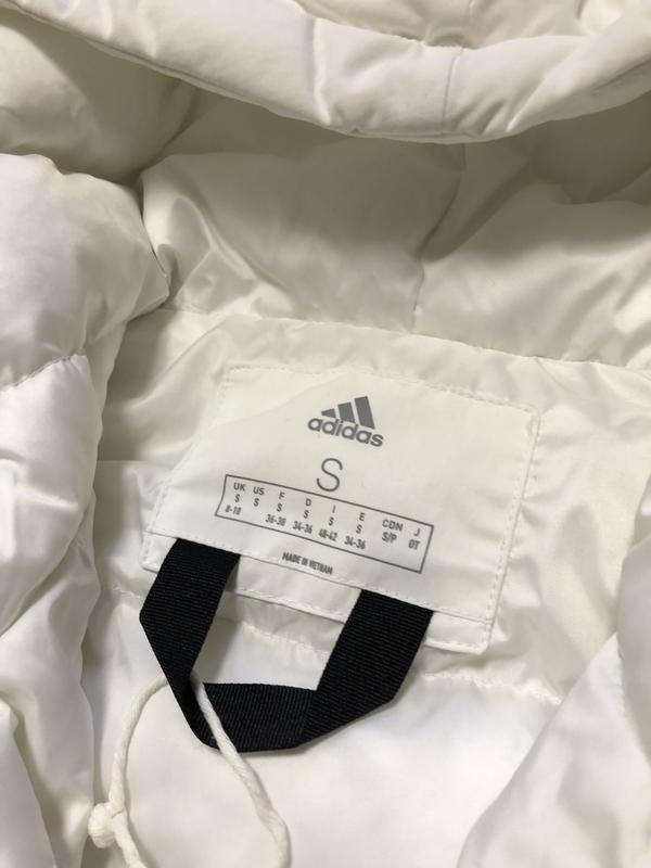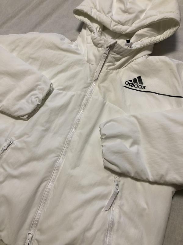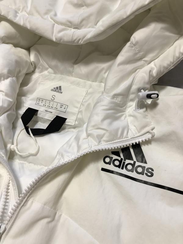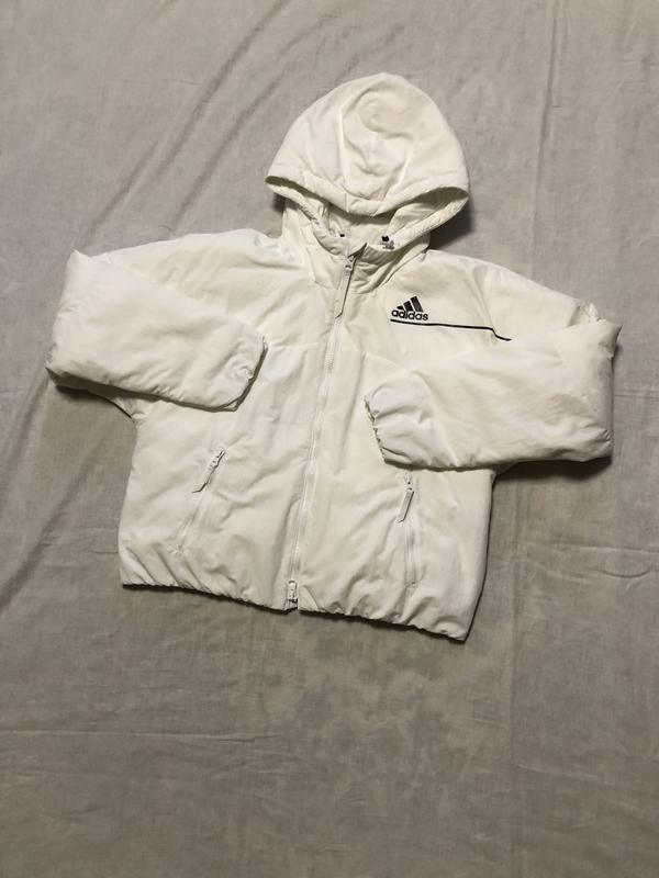 Білосніжний пуховик від Adidas,має фірмовий логотип на грудях та позаду.Капюшон на утяжках,по поясу та рукавах пуховик іде на манжеті.Стан нової річі.Розмір СТочні заміри:довжина-55 смдовжина рукава від горла-72 смобхват по грудях-56 см