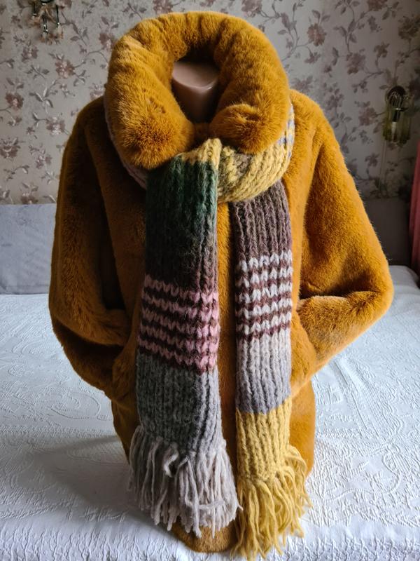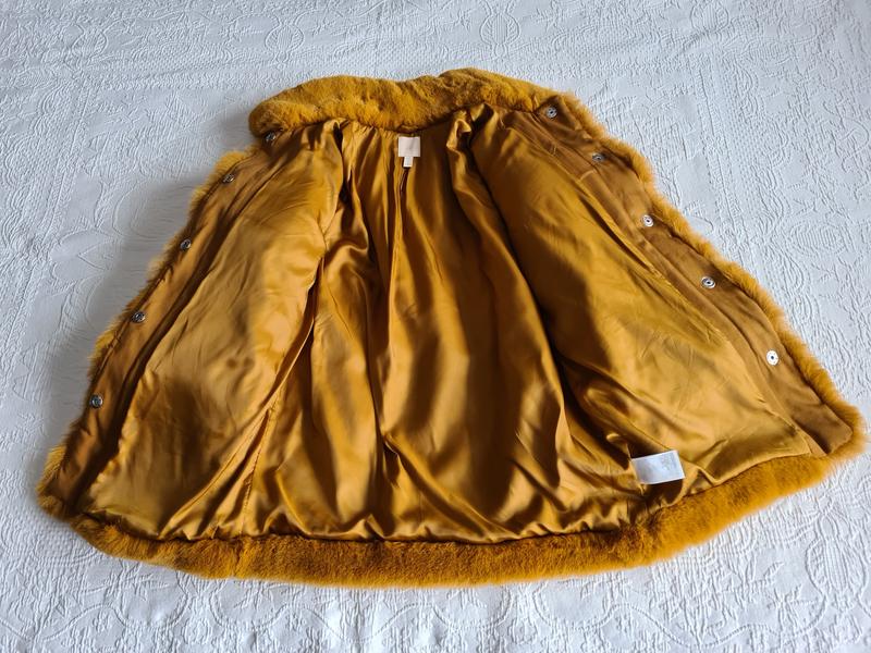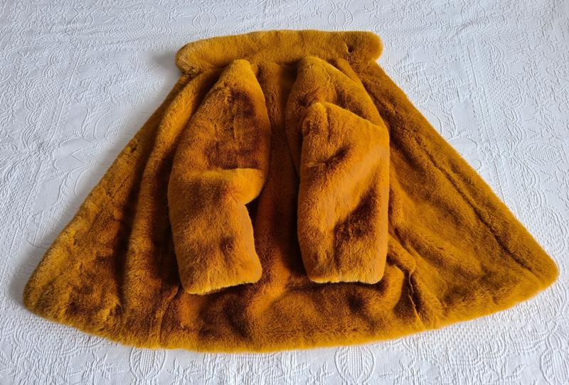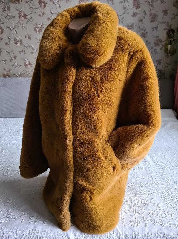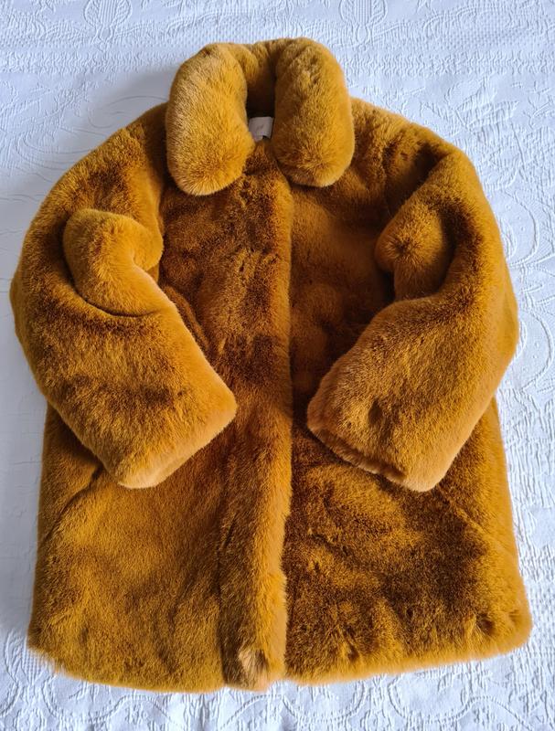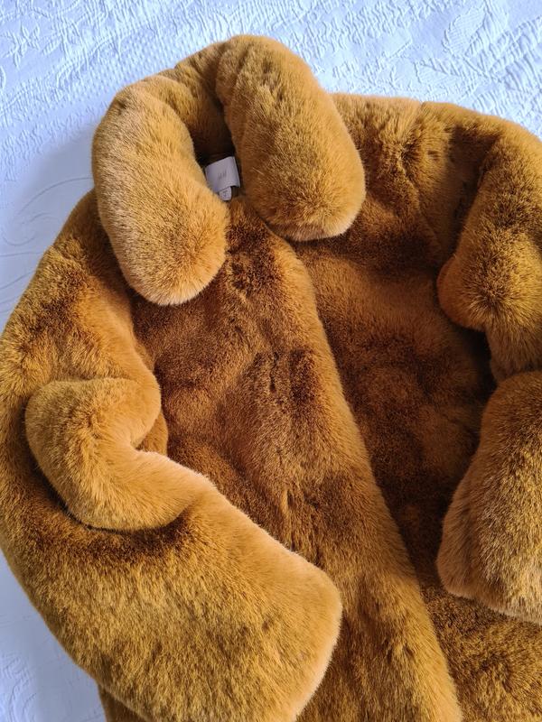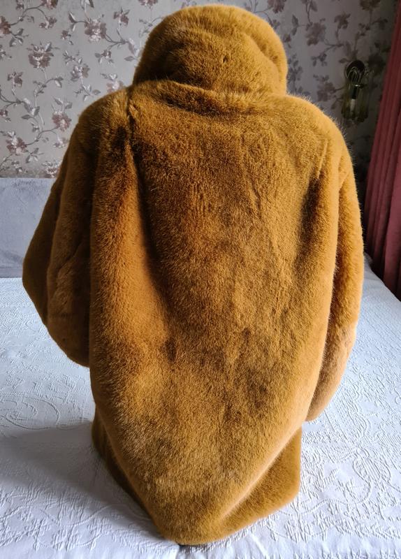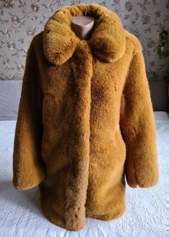 Прямий кожушок зі штучного меху. Комір та застібка на потайні кнопки спереду.