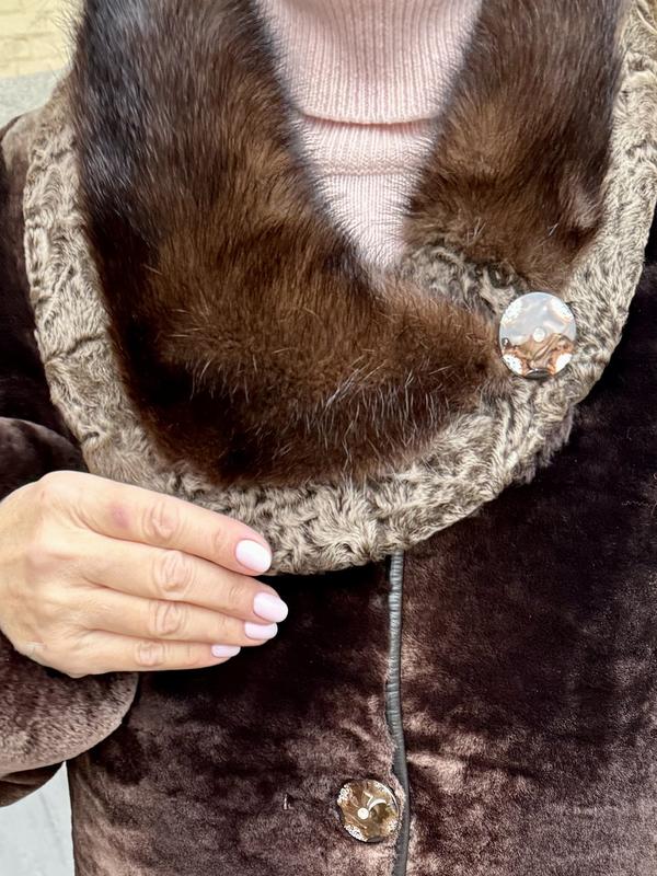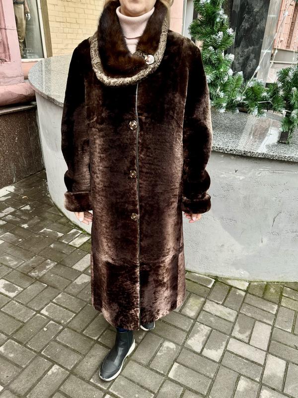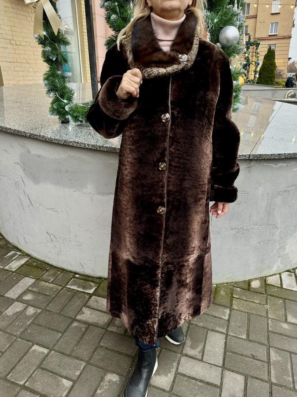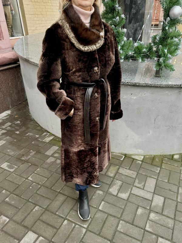 Шуба женская натуральная из овчины коричневая с воротником из норки.