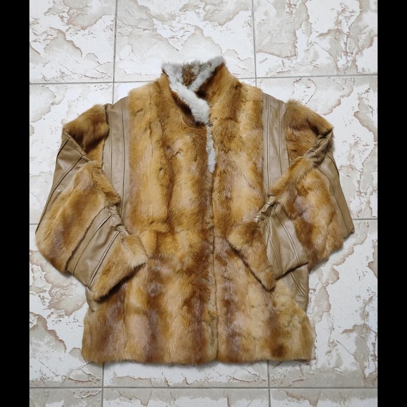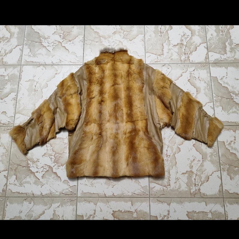 Куртка з вставками з натурального хутра. Рукави кажанчики в ідеальному стані, всі застібки на місці. Є дефект у місці коміру з внутрішнього боку, через те що куртку трохи не носили там інше хутро і воно пересохло та порвалось ( цю частину легко замінити у швеї,навіть просто на підклад) Розмір Л або оверсайз на М.