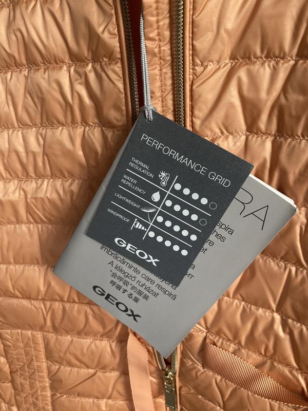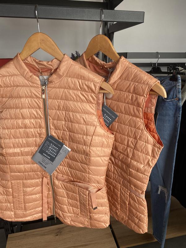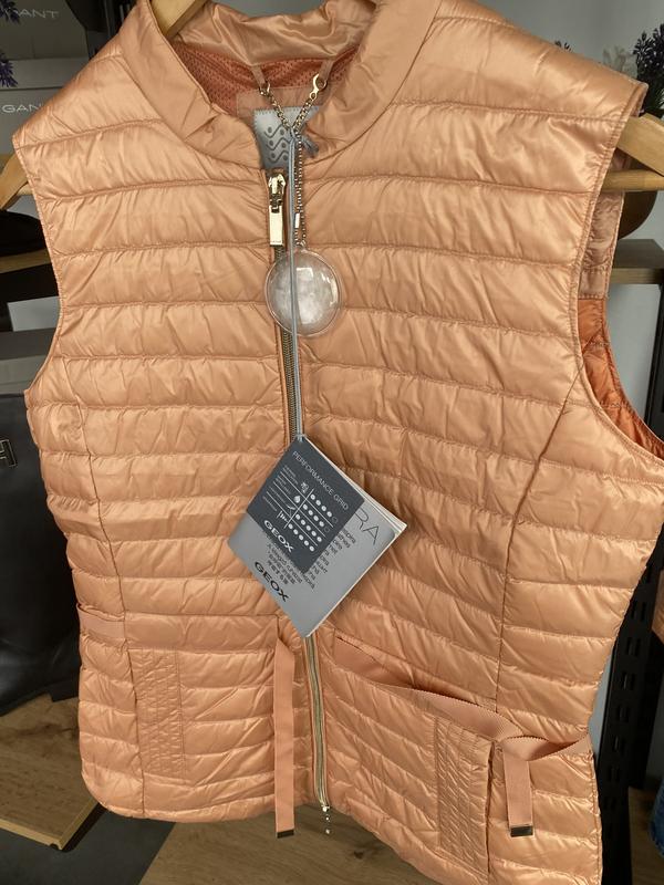 Оригінальна жіноча рухова жилетка відомого бренду Geox. Наповнювач пух/перо. Дихаючі тканини. Талія регулюється. Розмір SПОГ 46,5, стегна 46 см, талія 40,5 см, довжина 60 см, плечі 37 см