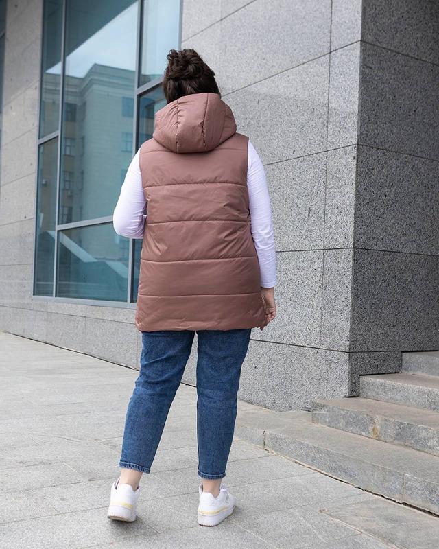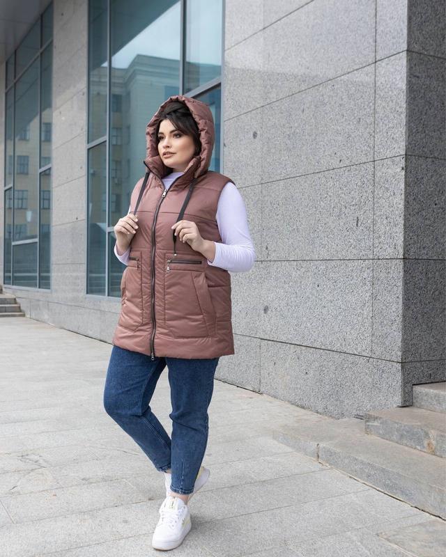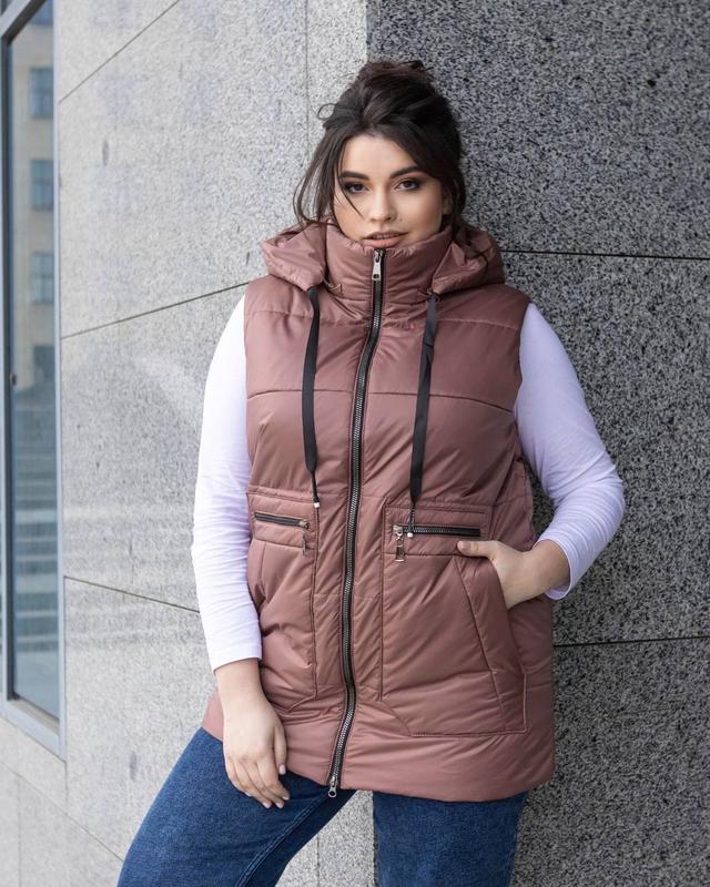 Жіночий жилет великого розміру. На пластиковій блискавці кольору срібла. На пілочці дві функціональні накладні кишені. Капюшон відстібається, має утяжки.