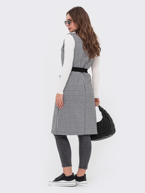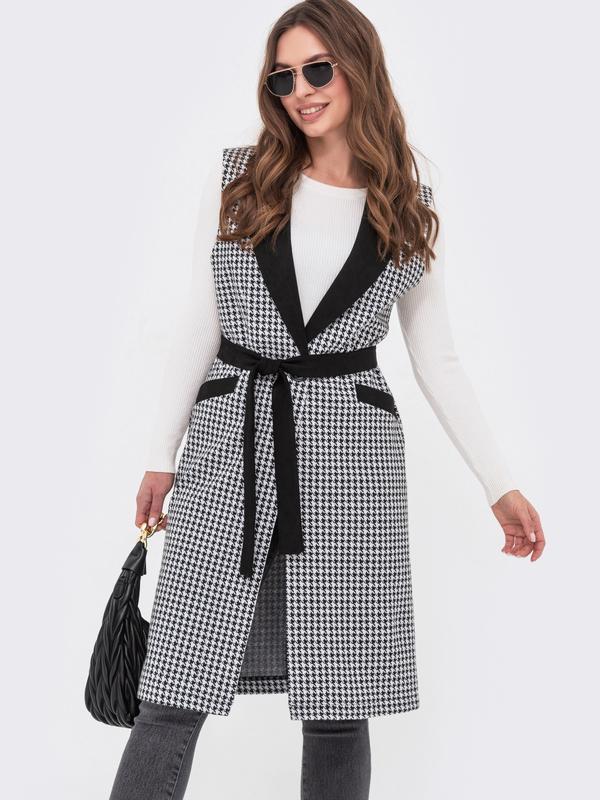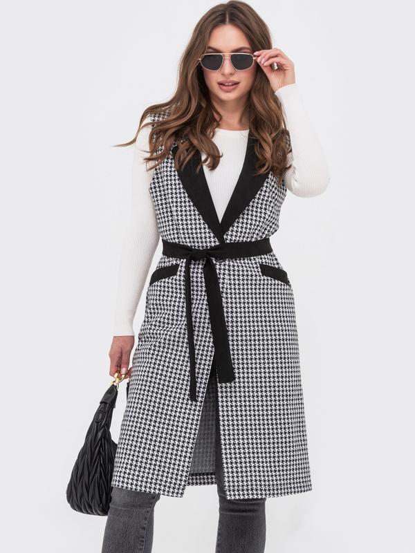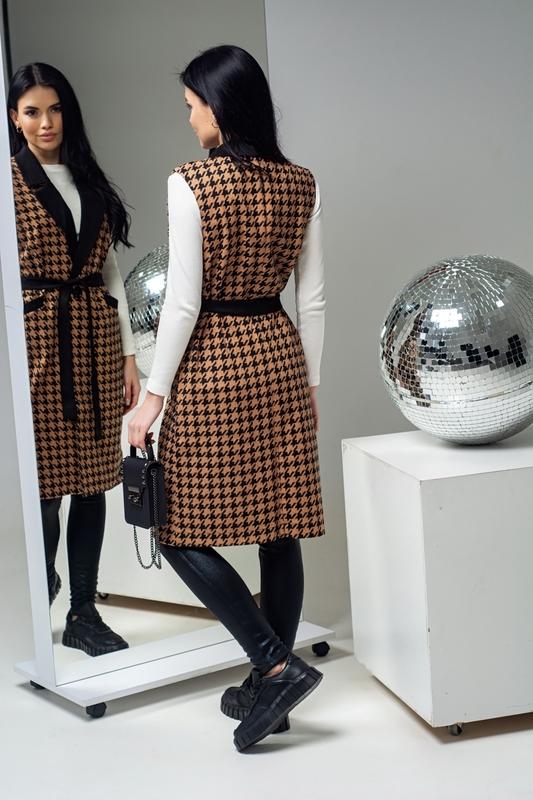 🔥Подовжений жилет приталеного крою. Відкладний комір та кишені виконані із замшу. Застібається на ґудзик. Пояс із замші входить до комплекту.