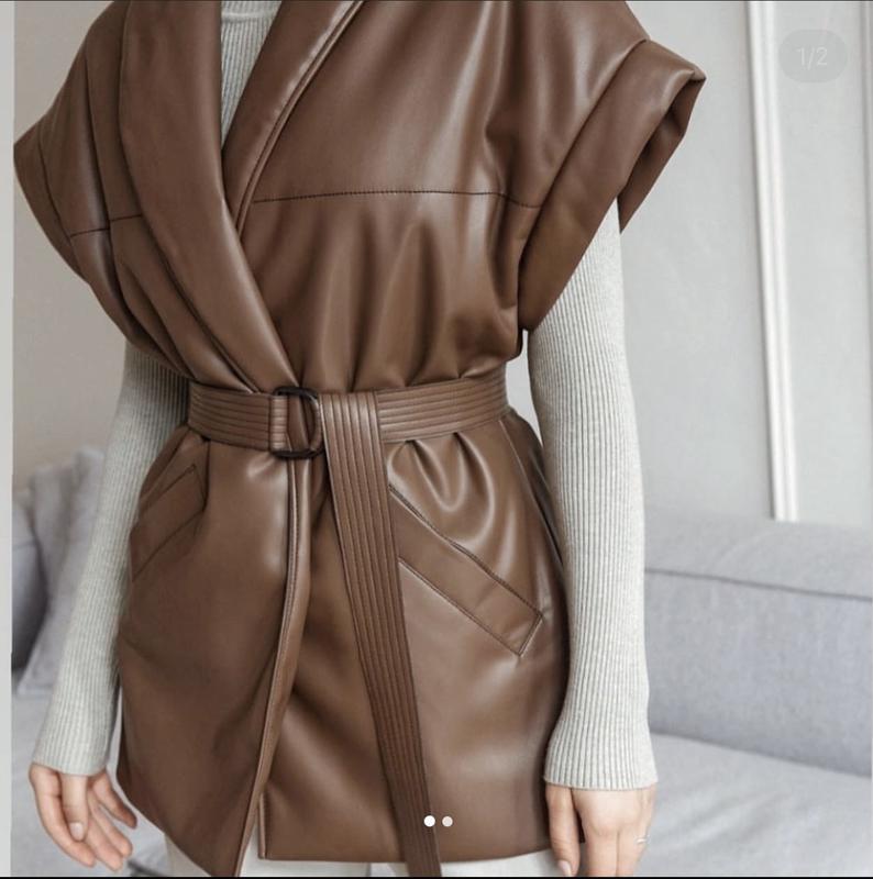 Стильний утеплений жилет із якісної екошкіри. Утеплення синтепух. Довжина 73 пог 55 поб 57. Заміри робилися в західному вигляді.
