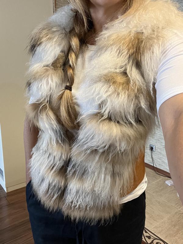 Пог 40Довжина по переду 58Довжина спинки 48По переду застібається на гачокХутро кролика та лами, чередуються смужки шириною по 6 см.