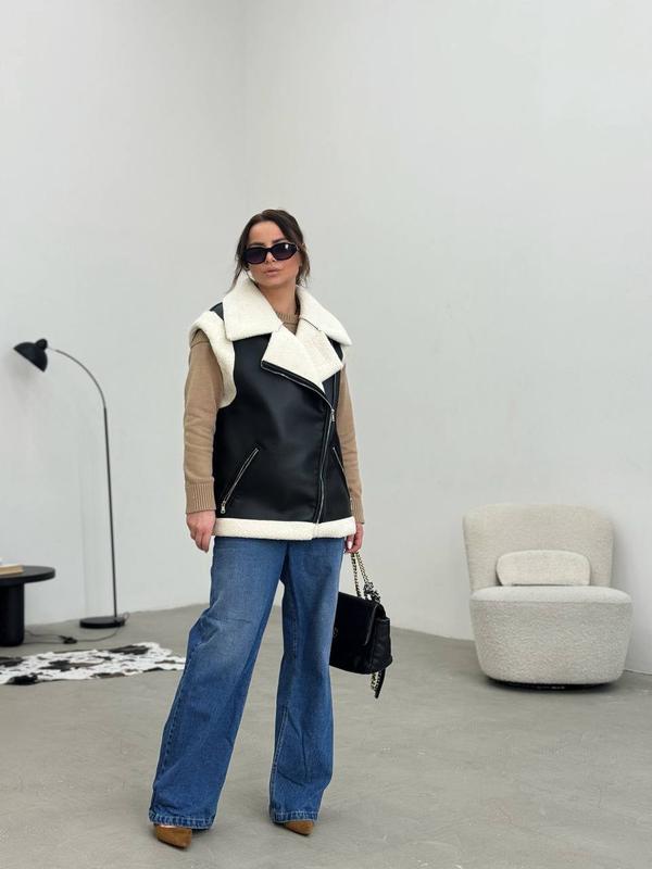 ЖилетЕко-шкіра, штучне хутро під овчину від натуральної не відрізнити зовсім, вона така ж м'яка, приємнаНа молніїФурнітура металШкіра щільна