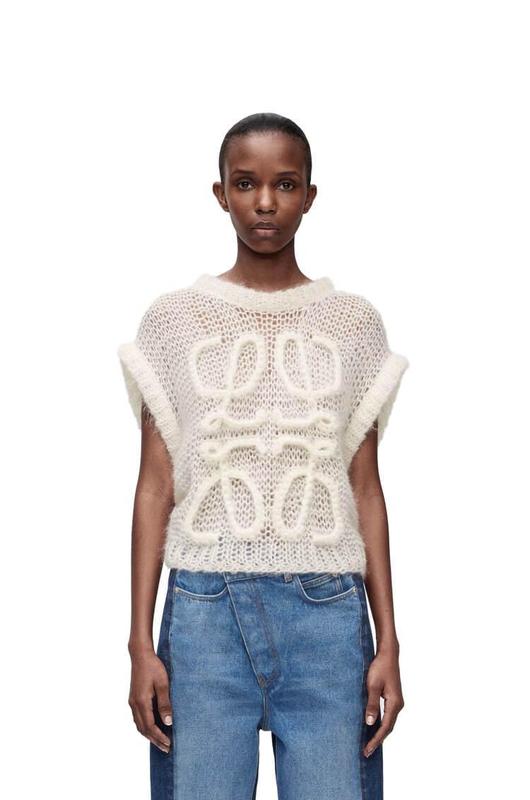Жилет Loewe Anagram з мохеру в білому кольорі — це елегантний і стильний елемент гардероба. Виготовлений із високоякісного мохеру, цей жилет поєднує в собі комфорт і розкіш. Логотип Loewe виготовлений із вишитих ниток, що надає йому оригінальності та робить вишуканим акцентом у вашому образі. М'який білий колір створює ніжний і стильний вигляд, що надає образу елегантності та класичності. Цей жилет стане невіддільною частиною вашого гардероба, надаючи йому шарм і стиль.