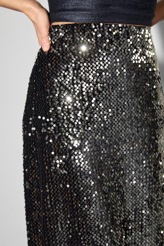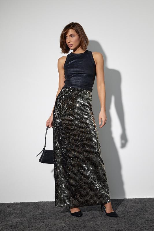 Ця довга спідниця - справжній витвір елегантності та розкоші. Вона зшита з оксамитової тканини, яка надає їй неповторної м'якості та шовковистості. Уся спідния прикрашений блискучими паєтками, які додають образу вишуканості та святкового сяйва.