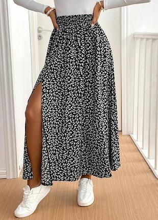 Має два однакові розрізи по боках та карманиЗверху на резинці Довжина - 106 см Ширина пояса - 31/44 см (резинка)Напівохват стегон - 74 см (сидить вільно)Глибина вирізу - 73 см