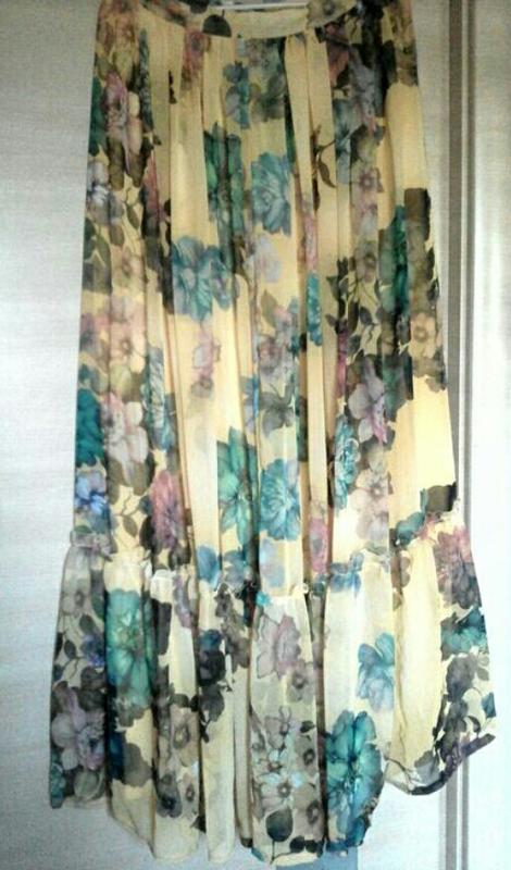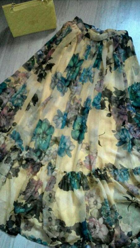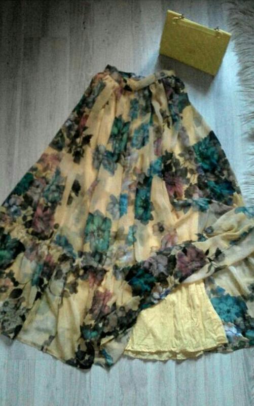 Шикарна трендова шифонова спідниця в підлогу жовтого кольору у великі квіти, з натуральною підкладкою. Клішна, на блискавці. Пояс до об'єму талії 72 см макс. Довжина 110 см. Дуже гарна. Розмір 36/38. Привесна з Іспанії.