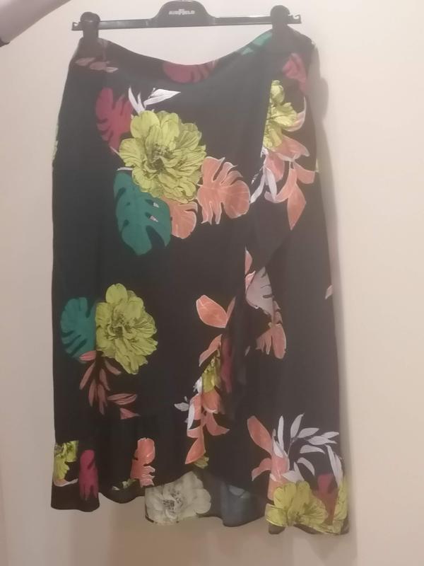 Стильна спідниця чорного кольору у квітковий тропічний принт Papaya. Преміальна якість тканини 100 % віскоза (штапель). Тканина шовковиста та легко струмує по тілу. Спереду запах та гарна оборка по краю. Асиметричний крій низу особливо вдало садяться на фігури великих розмірів. Збоку блискавка для більш комфортної посадки спідниці на фігуру та фіксатор у вигляді ґудзика та повітряної петельки. Яскравий квітковий принт додає модної родзинки у спідницю. Добре сідає на фігуру 20 UK 48 EU розміру. Спідниця добре буде поєднуватися з однотонними та білими футболками чи топами, а також з білими кедами або кросівками. Стан чудовий, дефектів немає Розміри: довжина з оборкою 80 см довжина оборки 12 см талія 52 (104) см бедра 63 (126) см Доставка Укрпоштою або Новою поштою. Попередня оплата на картку Монобанку Обмін та повернення речей не передбачено